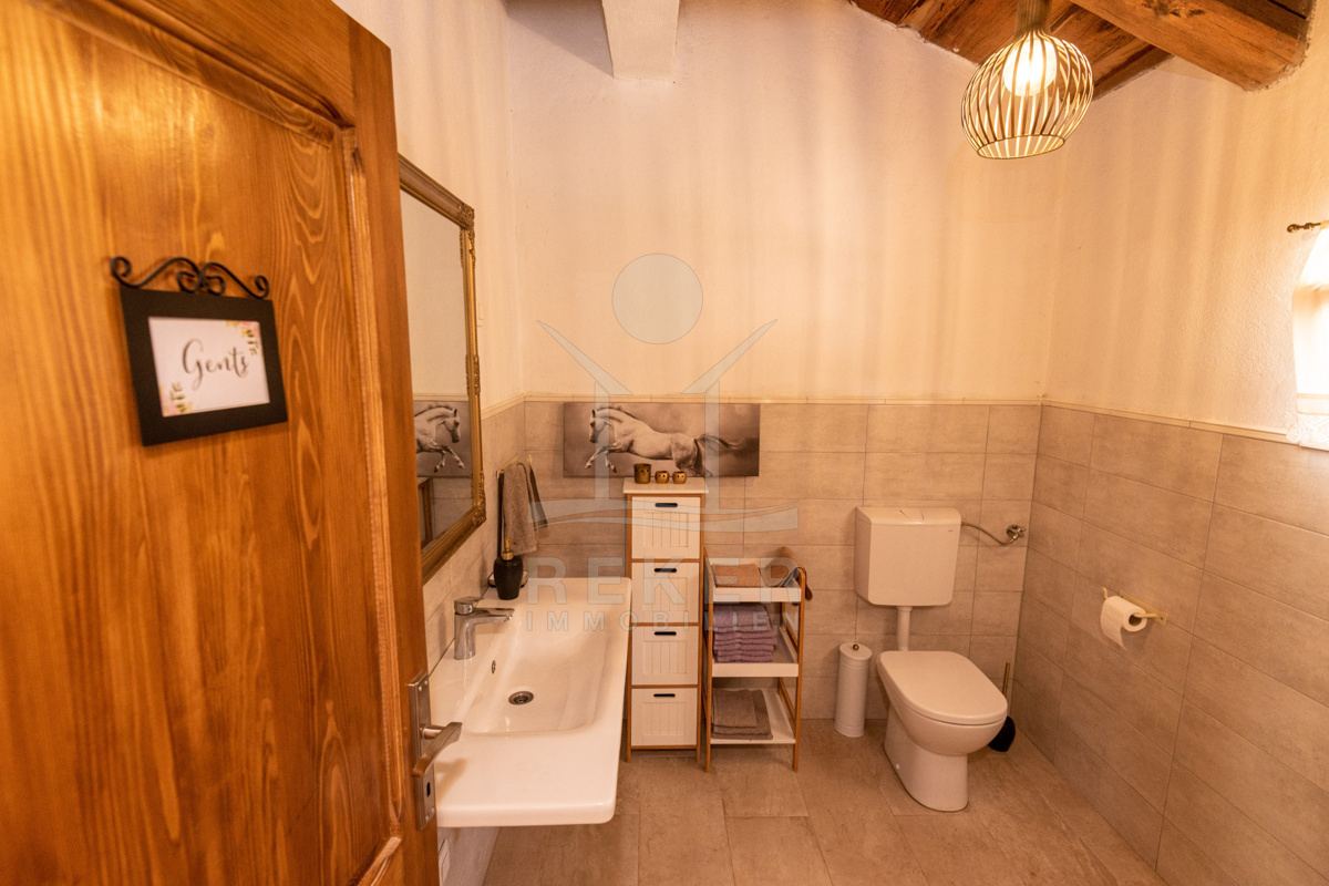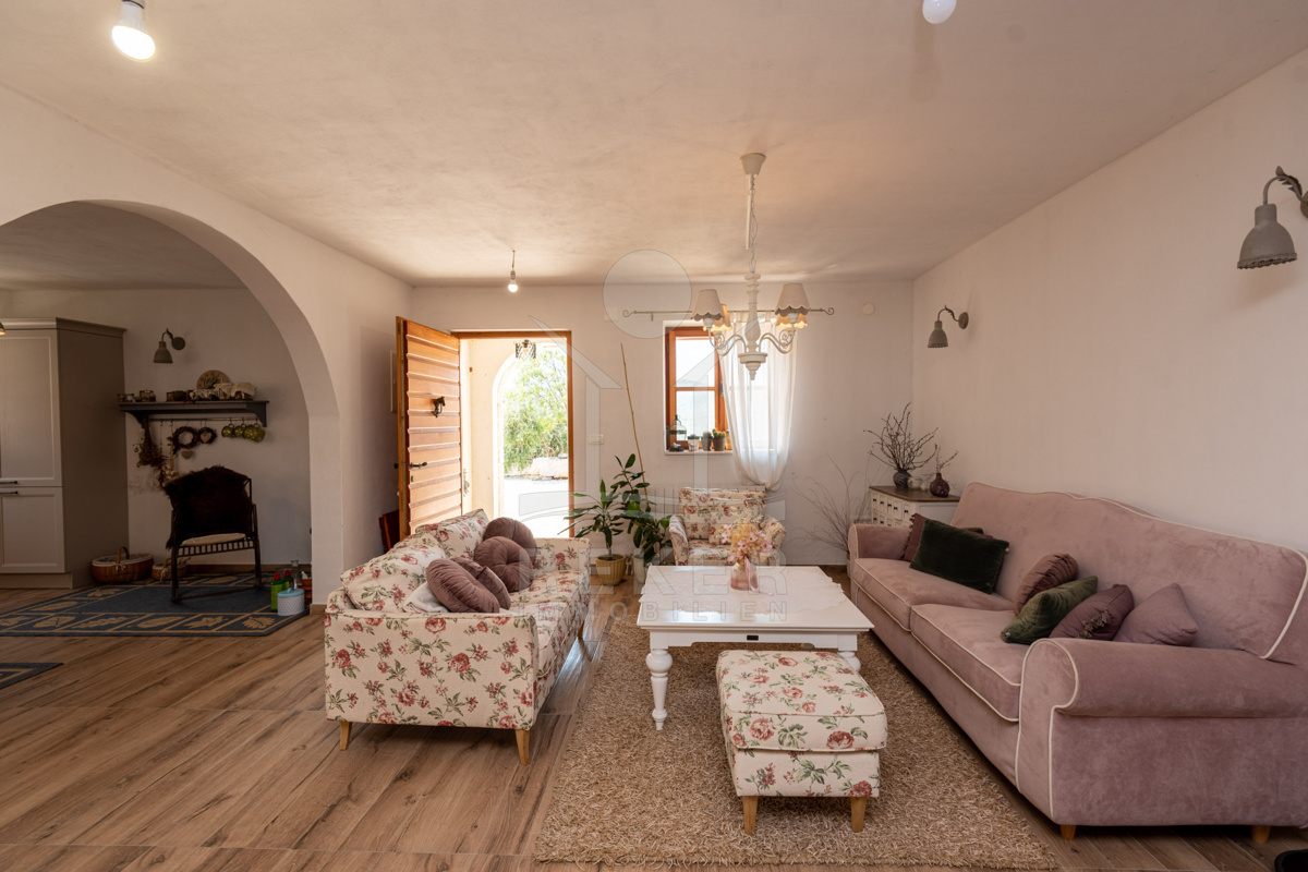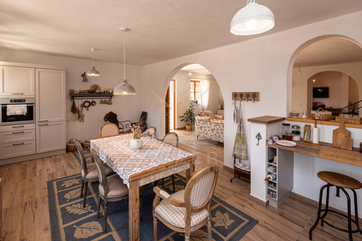 Die vollständig möblierte Villa beherbergt im Erdgeschoss eine einladende Taverne für gesellige Zusammenkünfte, 2 WCs sowie ein Wohn-Ess- und Küchenzimmer mit rustikalem und wunderbarem Ambiente.