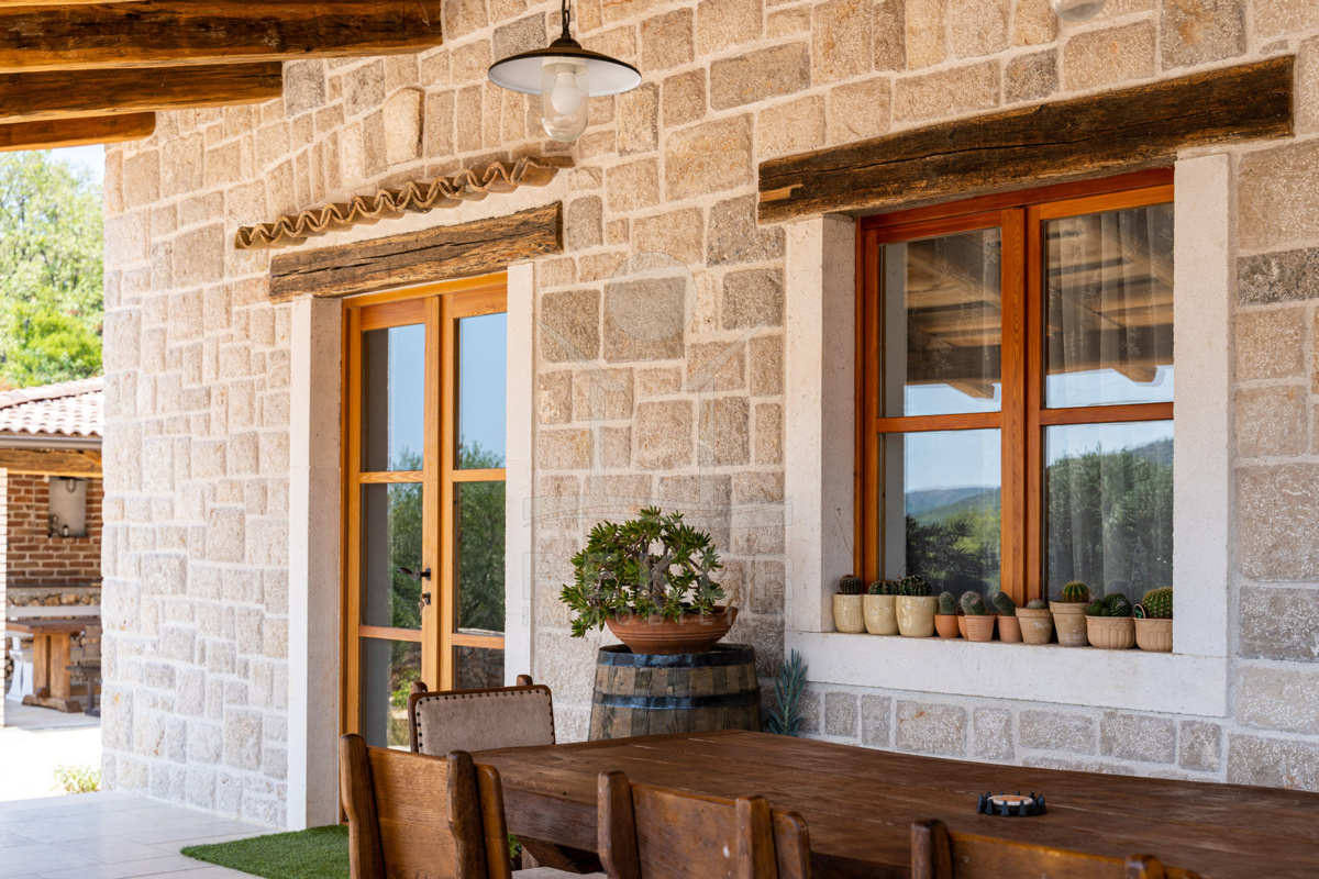 Die großzügige Außenanlage punktet mit einem Pool (20 m²), einer überdachten Terrasse zum Entspannen, einem rustikalen Steingrill, einer Outdoorküche und einem Bereich zum Verweilen im Freien. Diese Oase wird Ihnen Freude bereiten. Mit Platz für 7 Fahrzeuge ist auch der Parkplatz großzügig dimensioniert und bietet luxuriösen Wohnkomfort inmitten einer malerischen Landschaft.