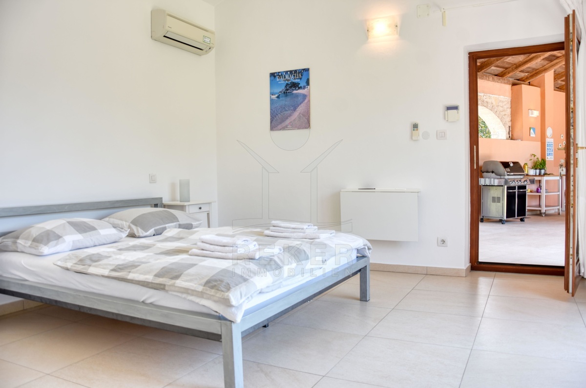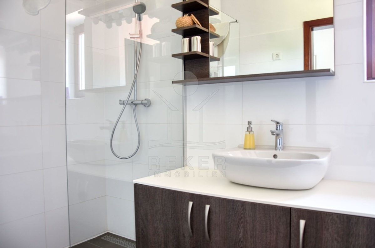 Im Inneren setzt sich das angenehme Wohngefühl fort. Das Erdgeschoss ist offen gestaltet: Küche, Essbereich und Wohnzimmer gehen ineinander über. Die Einbauküche mit Kücheninsel ist komplett ausgestattet, der Holzkamin bringt an kühleren Tagen wohlige Wärme. Ein Gästezimmer mit eigenem Bad ergänzt das Erdgeschoss und bietet Rückzugsmöglichkeit für Besucher. Im Obergeschoss warten zwei weitere Schlafzimmer – beide mit eigenem Bad und direktem Zugang zur Terrasse. Holzelemente und Naturstein schaffen eine Atmosphäre, die charmant und hochwertig zugleich ist. Fußbodenheizung und Klimaanlage sorgen das ganze Jahr über für ein gutes Raumklima. Die Villa wird voll möbliert verkauft – ganz einfach einziehen und ankommen.