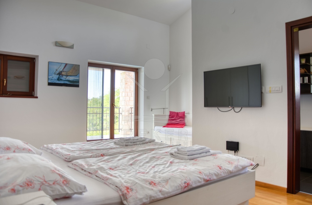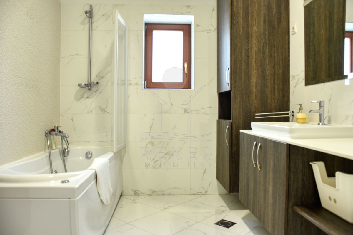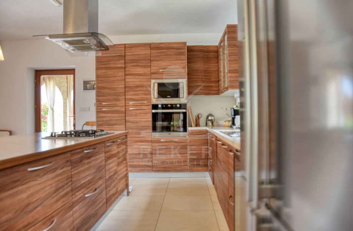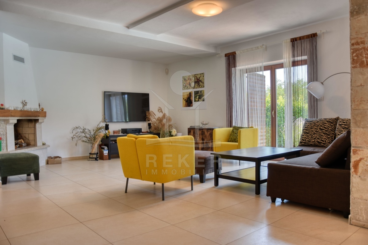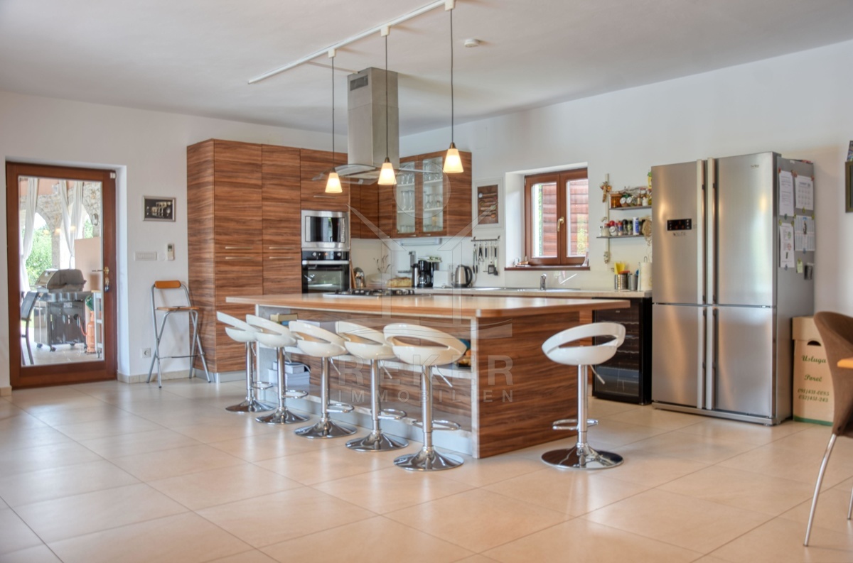 Ein kleines Stück Ruhe inmitten von Istrien – genau das erwartet Sie hier, am Waldrand nähe Kringa in der Gemeinde Tinjan. Die Steinvilla steht in einem ruhigen Wohngebiet mit viel Abstand zur Nachbarschaft. Bis zur Küste sind es nur 15 Kilometer, der Alltag spielt sich hier aber ganz bewusst fern vom Trubel ab. Die Ausrichtung nach Südwesten bringt angenehmes Licht bis in die Abendstunden. Drei Parkplätze stehen auf dem Grundstück bereit, zwei davon überdacht – angenehm im Sommer wie im Winter.