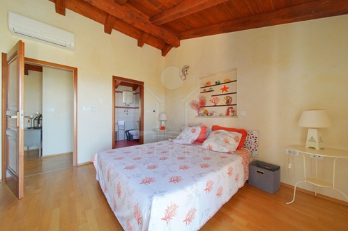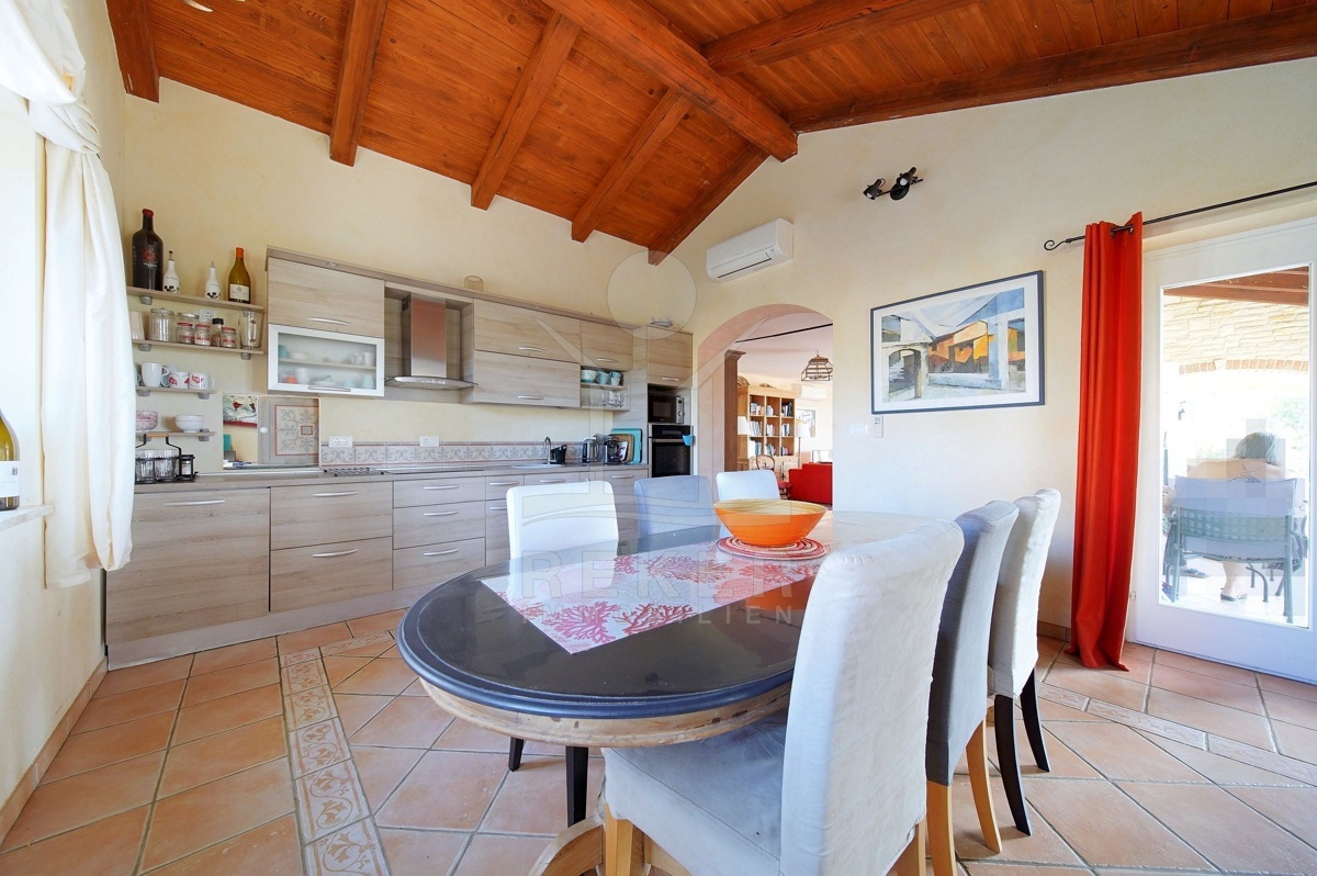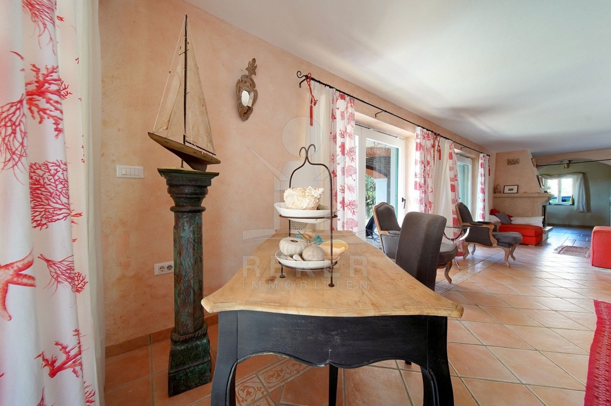 Im Außenbereich zeigt sich mediterranes Flair mit gepflegten Grünflächen, Olivenbäumen und Zypressen. Der 50 m² große Pool mit Sonnenterrasse und Außendusche bildet das Herzstück. Zwei überdachte Terrassen bieten einen herrlichen Blick aufs Meer. In der großzügigen Sommerküche mit Steinherd und offenem Kamin lässt sich der Abend gemütlich ausklingen. Dank der Südwestlage scheint die Sonne den ganzen Tag. Das Anwesen grenzt an landwirtschaftliches Gebiet, auf dem keine weitere Bebauung erlaubt ist. So genießen Sie dauerhaft Ruhe und Privatsphäre. Eine seltene Gelegenheit für alle, die Natur, Meerblick und authentische Bauweise schätzen.