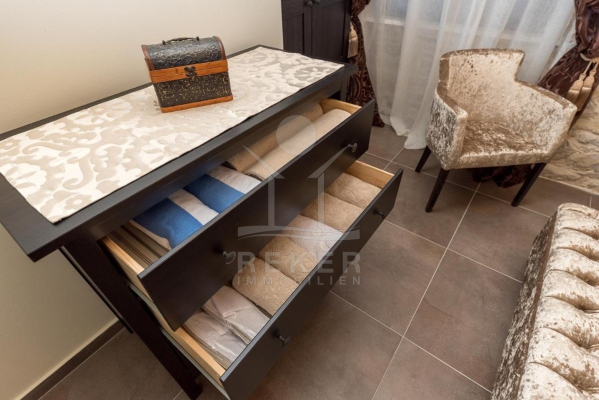 Diese traumhafte Wohnung ist mit einer Klimaanlage ausgestattet und wird komplett möbliert verkauft. Der großzügige Grundriss des Erdgeschosses beherbergt einen einladenden Wohn-, Ess- und Küchenbereich mit einer hochwertig ausgestatteten Küche sowie einem Gäste-WC. Die geschmackvolle und elegante Einrichtung strahlt Harmonie aus und ist ein wahrer Augenschmaus.