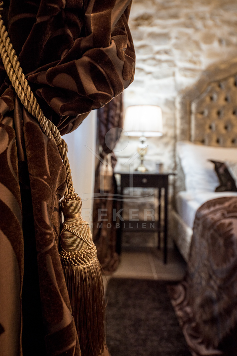 Über eine mit geschnitzten Steinen verzierte Treppe gelangen Sie in den ersten Stock, der mit einer Sauna, einem Badezimmer und zwei Schlafzimmern mit eigenen Bädern aufwartet. Jede Ecke strahlt Perfektion aus.