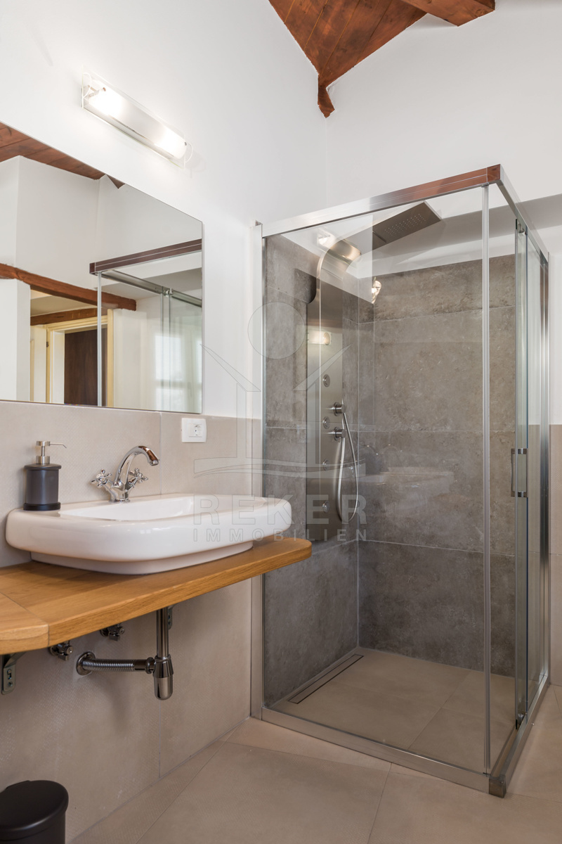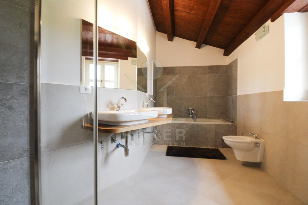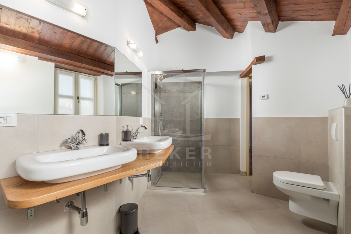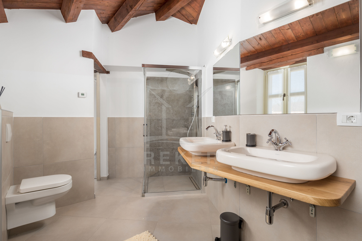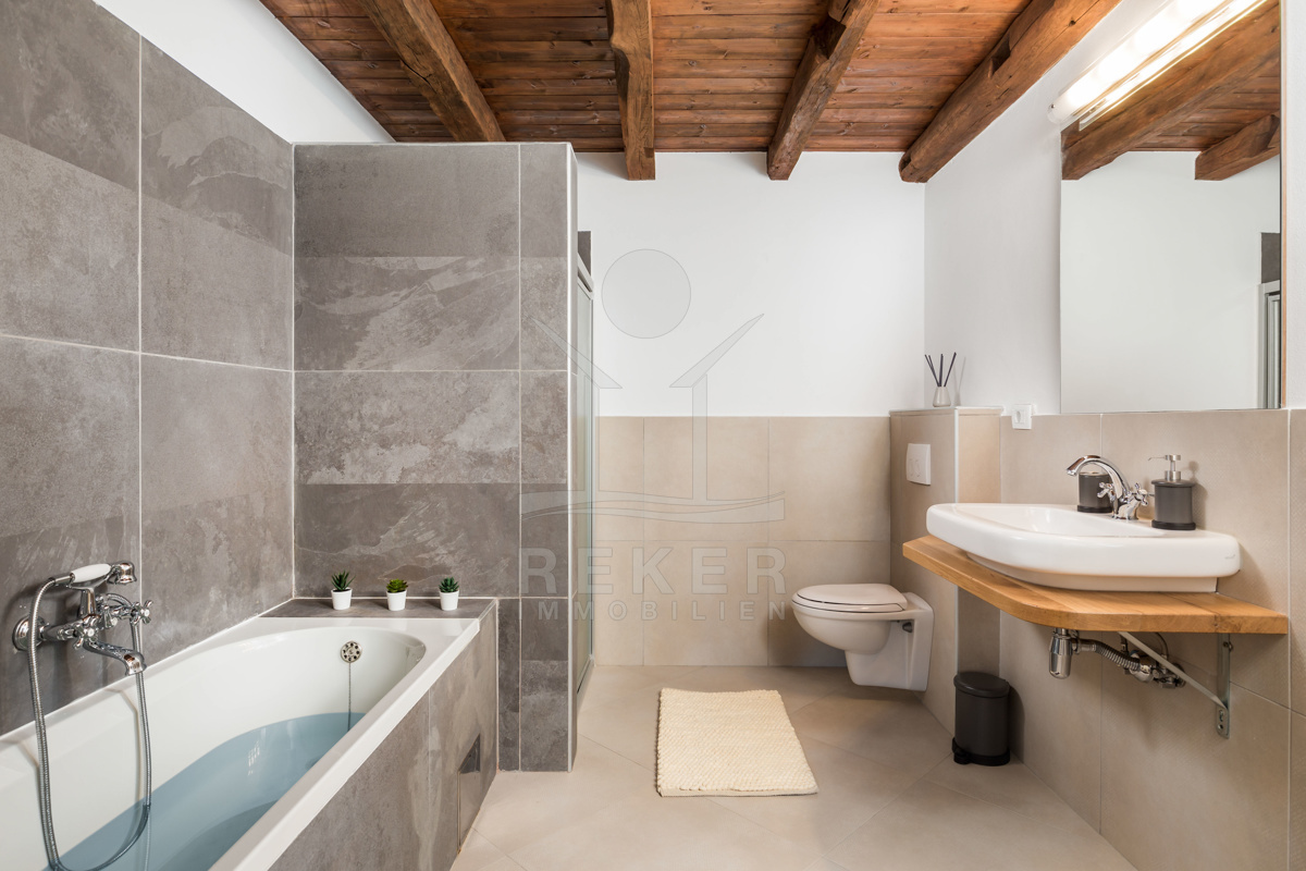 Auch in den vier Bädern wurde die Kombination aus landestypischer Architektur und modernem Interieur geschmackvoll umgesetzt. Die Bäder sind mit hochwertigen Sanitäranlagen ausgestattet und die rustikalen Akzente harmonieren perfekt dazu.