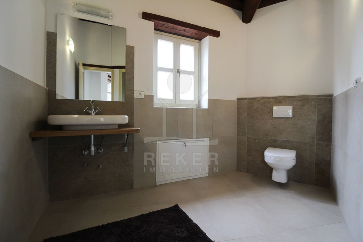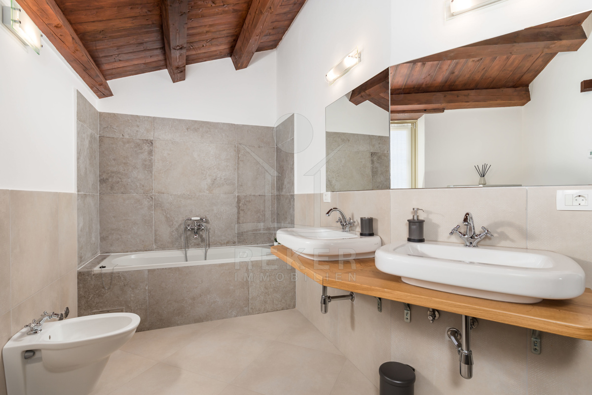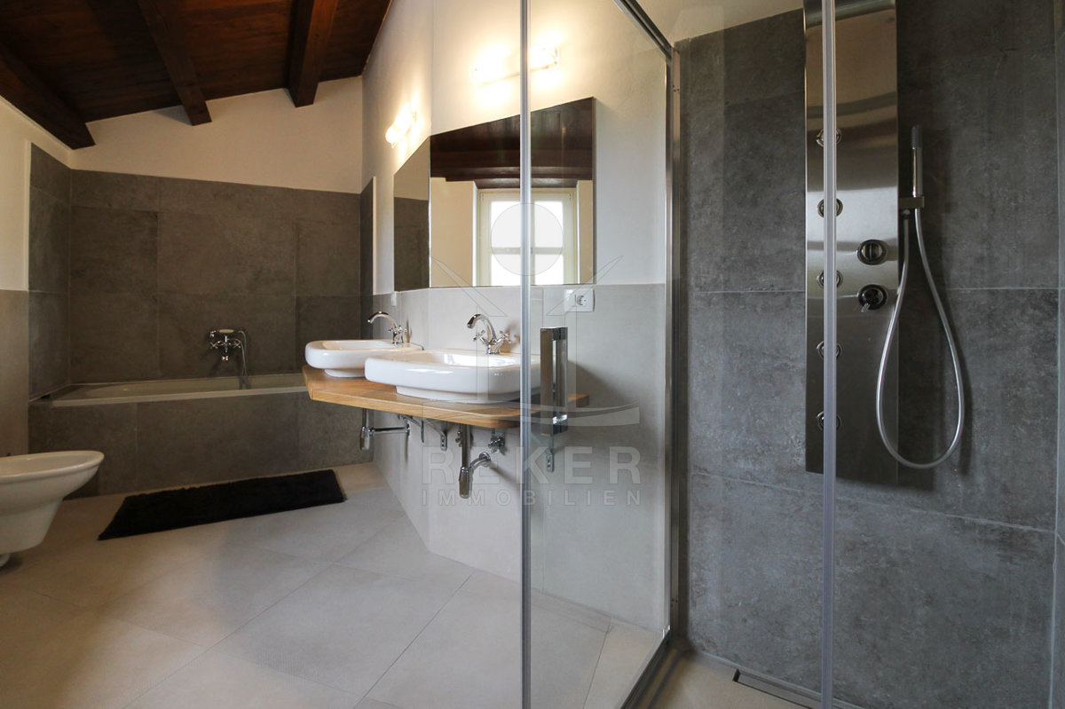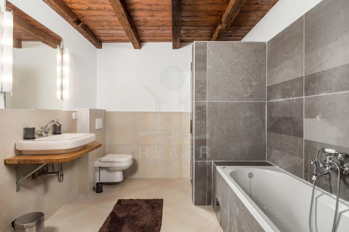 Auch in den vier Bädern wurde die Kombination aus landestypischer Architektur und modernem Interieur geschmackvoll umgesetzt. Die Bäder sind mit hochwertigen Sanitäranlagen ausgestattet und die rustikalen Akzente harmonieren perfekt dazu.
