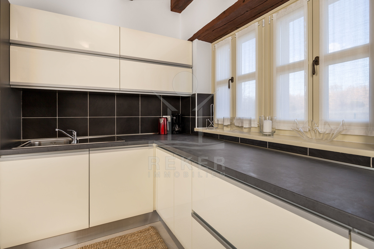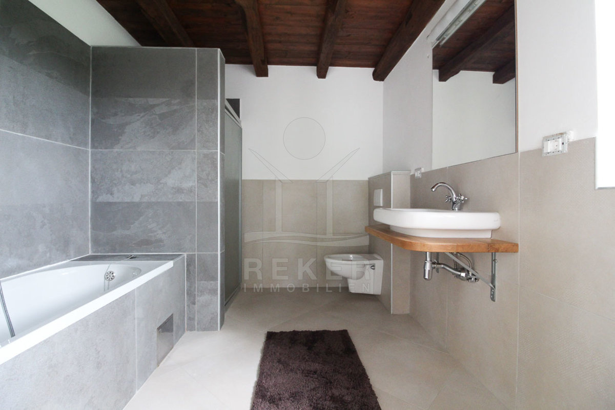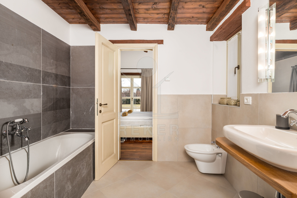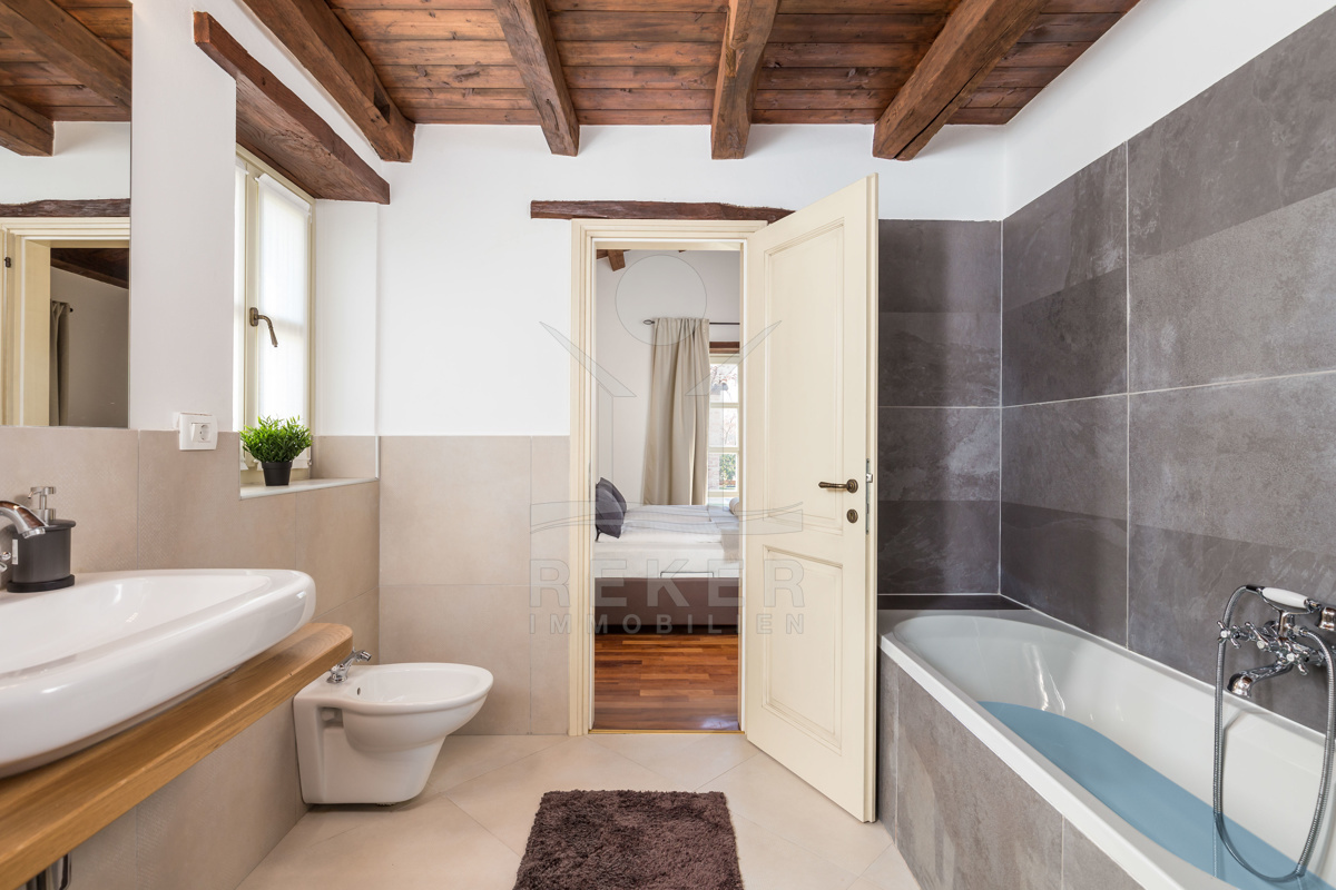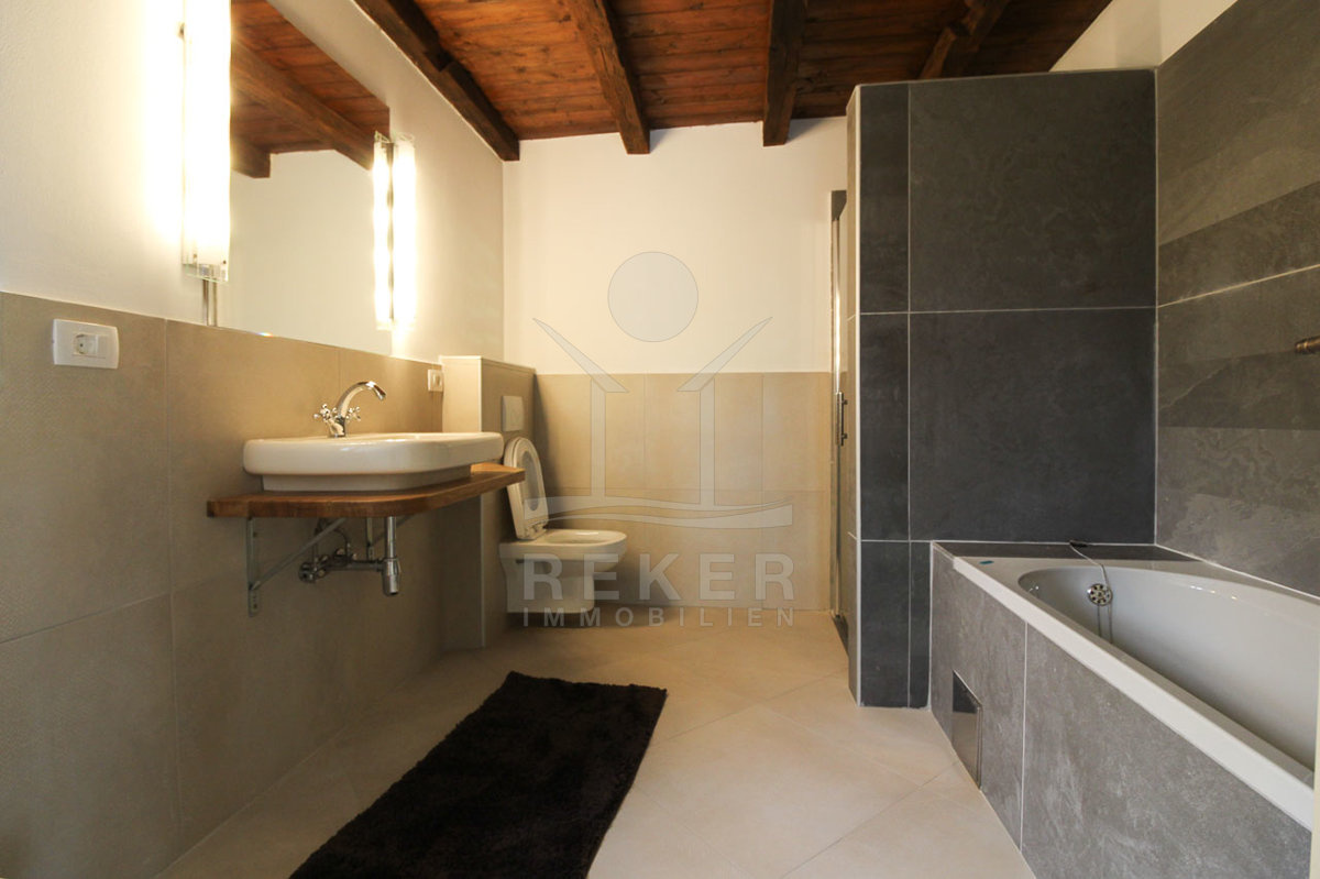 Auch in den vier Bädern wurde die Kombination aus landestypischer Architektur und modernem Interieur geschmackvoll umgesetzt. Die Bäder sind mit hochwertigen Sanitäranlagen ausgestattet und die rustikalen Akzente harmonieren perfekt dazu.