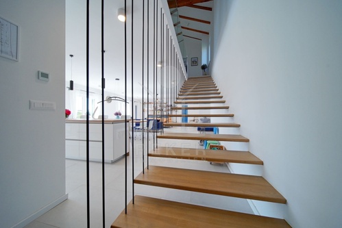 Im Erdgeschoss (184,9 m²) empfängt Sie ein offener Wohn- und Essbereich mit Zugang zur Terrasse. Dazu eine moderne Küche, Sauna mit Gartenausgang, Gäste-WC, Waschraum und Abstellraum. Das Obergeschoss (141,4 m²) bietet vier Schlafzimmer mit jeweils eigenem Bad. Das Hauptschlafzimmer verfügt über eine Ankleide und Zugang zu zwei Terrassen, eine davon überdacht. Im 35 m² großen Keller befindet sich zusätzlicher Stauraum.