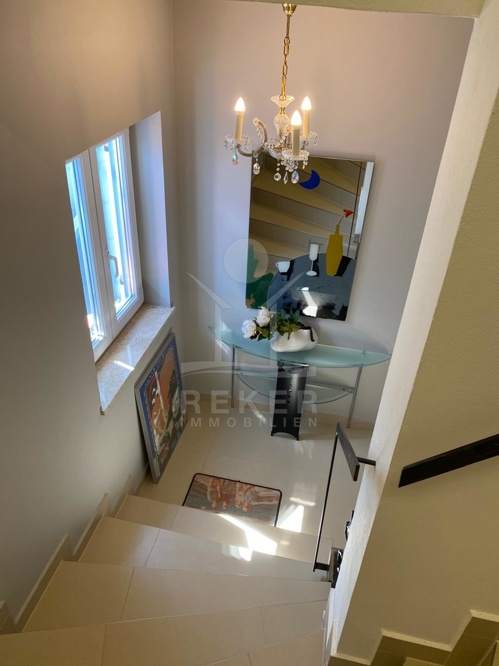 Im Erdgeschoss dieser beeindruckenden Villa befindet sich der Eingang, der zu einer modernen Ferienwohnung führt. Zudem finden Sie eine Garage, einen Werkraum und einen praktischen Abstellraum – ideal für zusätzlichen Stauraum.