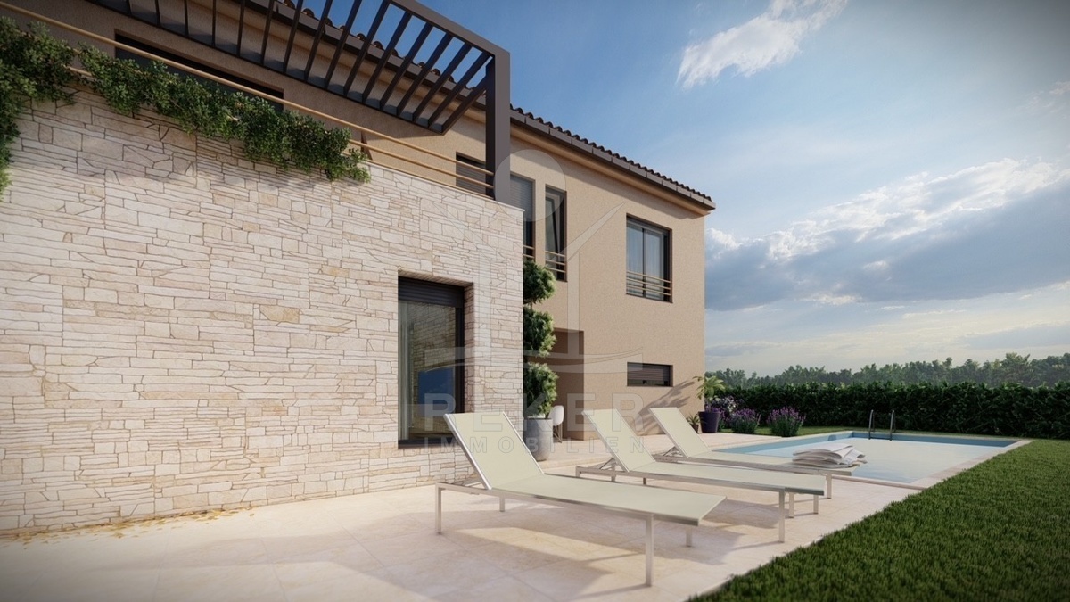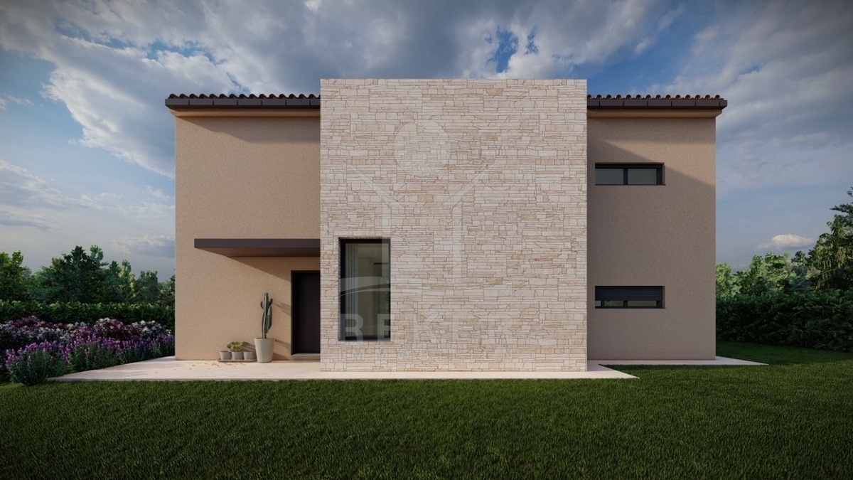 Ruhig wohnen, grün drumherum und trotzdem nicht abgeschieden – diese Villa entsteht im Ortsteil Baderna bei Poreč. Ein Platz am Rand des Waldes, mit Meerblick in der Ferne.