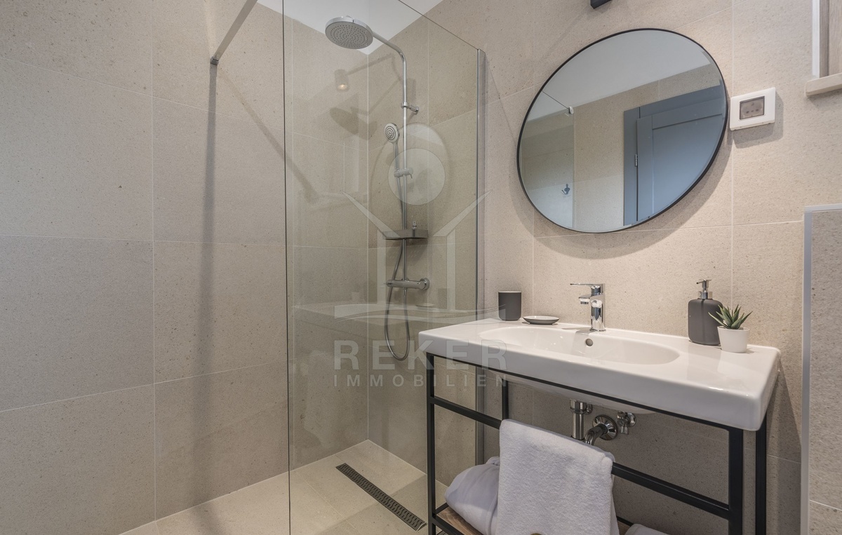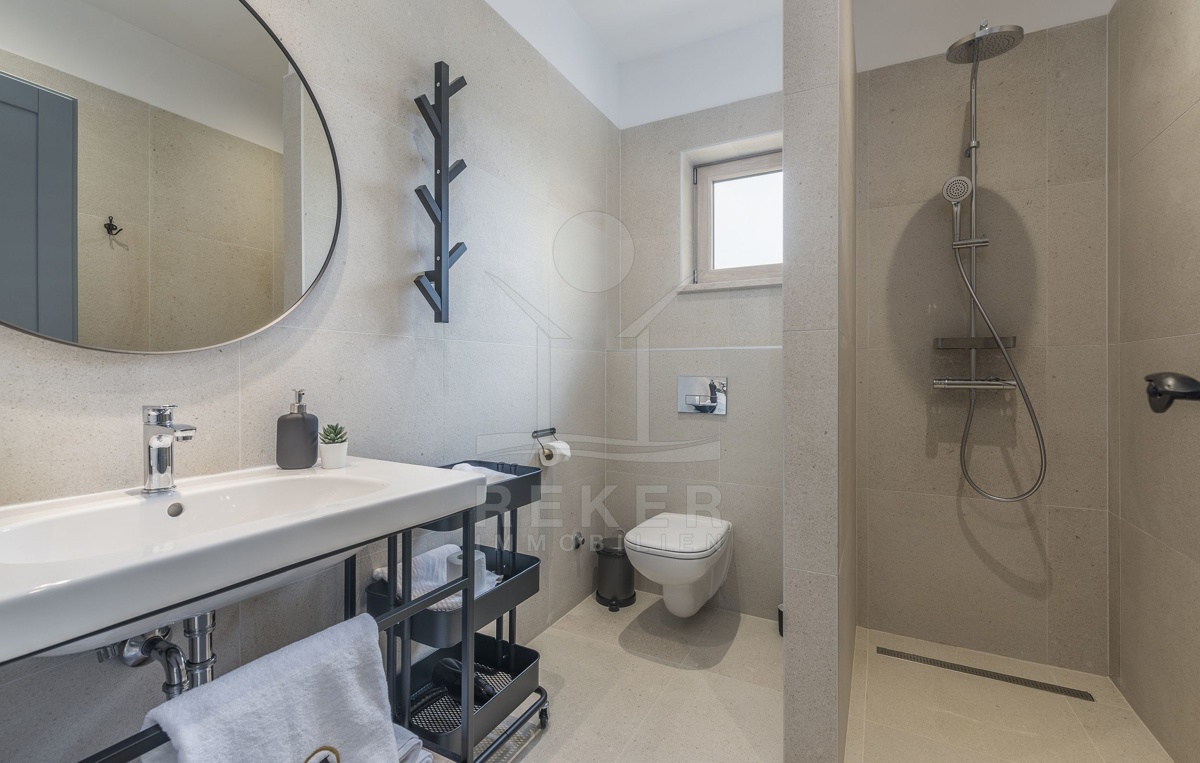 Das Anwesen bietet allen modernen Komfort, den man sich wünschen kann. Dazu gehören Klimaanlagen, elektrische Fußbodenheizung, ein elektrischer Warmwasserspeicher und eine umfassende Möblierung, die bereits im Preis enthalten ist. Im Erdgeschoss des Hauses befindet sich der Eingangsbereich. Auf einer großzügigen Fläche von 99 m² finden Sie hier ein gemütliches Wohnzimmer mit einem Essbereich, eine moderne Küche, ein komfortables Schlafzimmer mit eigenem Badezimmer und eine überdachte Terrasse, ideal zum Entspannen im Freien.