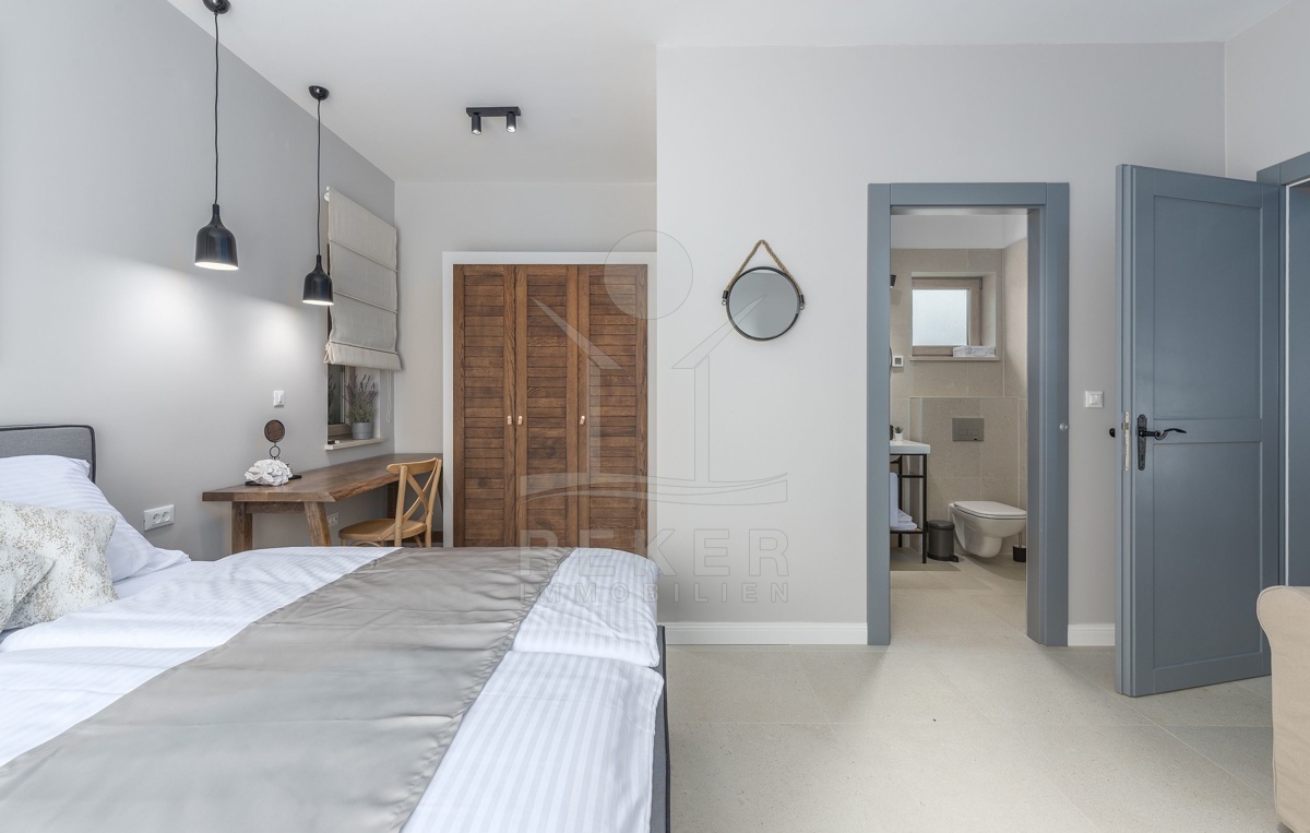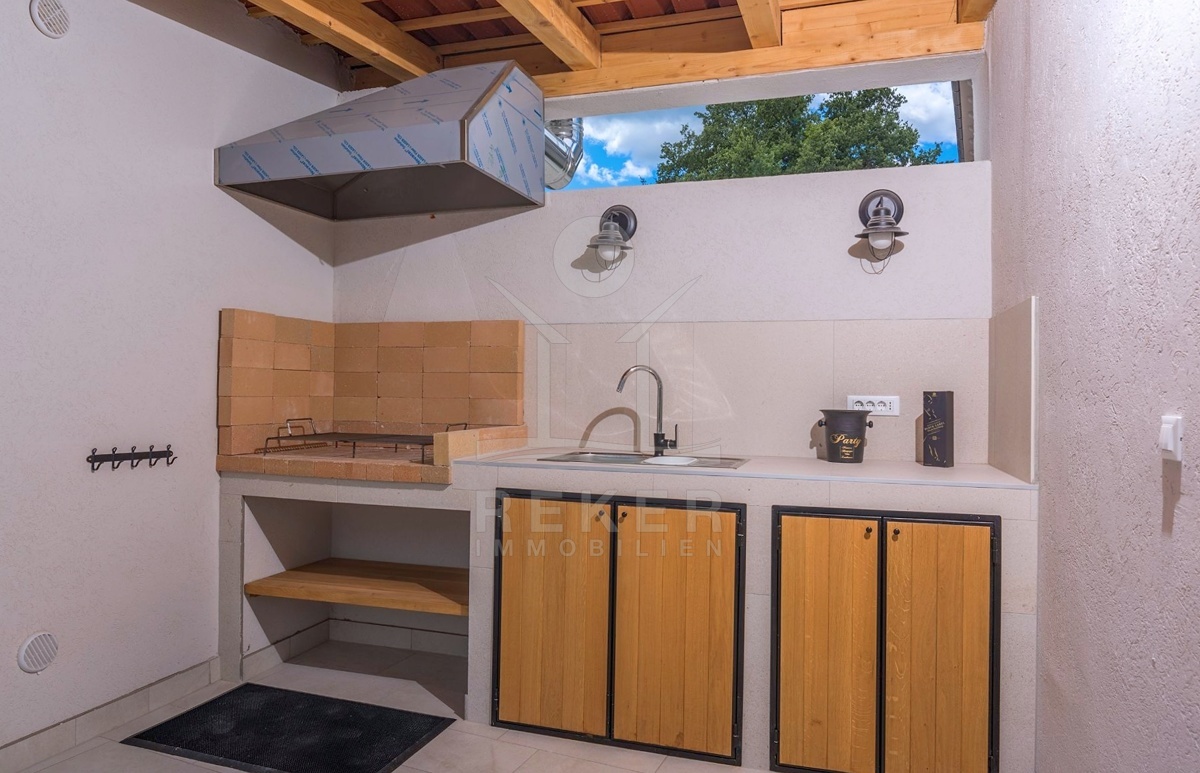 Der Außenbereich dieser Villa lädt zum Entspannen und Genießen ein. Der großzügige Pool mit einer Fläche von 32 m² bietet erfrischende Momente an heißen Sommertagen. Neben dem beheizten Pool und der Solaraußendusche gibt es auch eine Sommerküche mit einer Fläche von 31 m², die perfekt für Grillabende und geselliges Beisammensein geeignet ist. Eine Sonnenterrasse mit bequemen Liegestühlen und einer Solardusche lädt zum Sonnenbaden und Relaxen ein. Diese Villa bietet nicht nur ein stilvolles Zuhause, sondern auch eine hervorragende Möglichkeit, den Außenbereich zu genießen.
