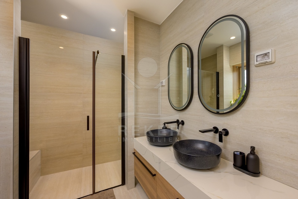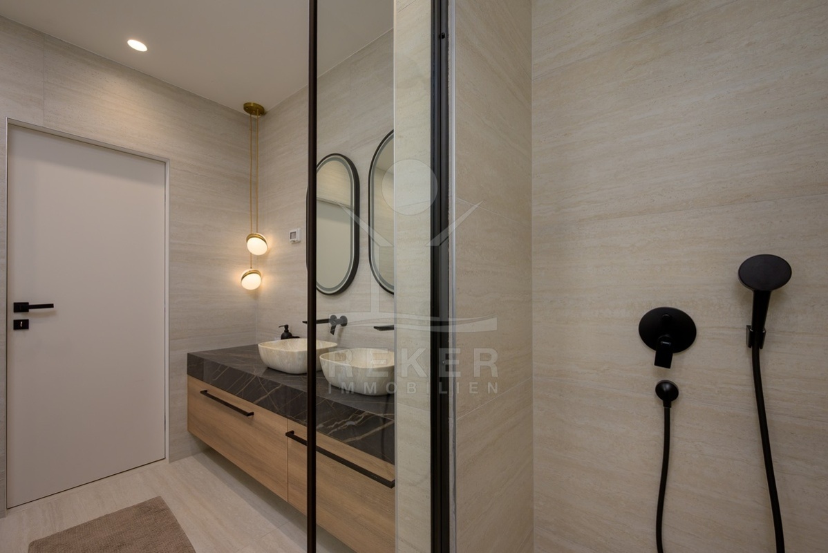 Im Erdgeschoss empfängt Sie ein heller Eingangsbereich. Hier befinden sich auch ein Gäste-WC und der Technikraum. Herzstück dieser Ebene ist der offene Wohn- und Essbereich mit moderner Designküche, Kücheninsel und hochwertigen Geräten. Von hier gelangen Sie direkt auf die überdachte Terrasse und in den Garten. Zwei Schlafzimmer, beide mit eigenem Bad, runden diese Etage ab.