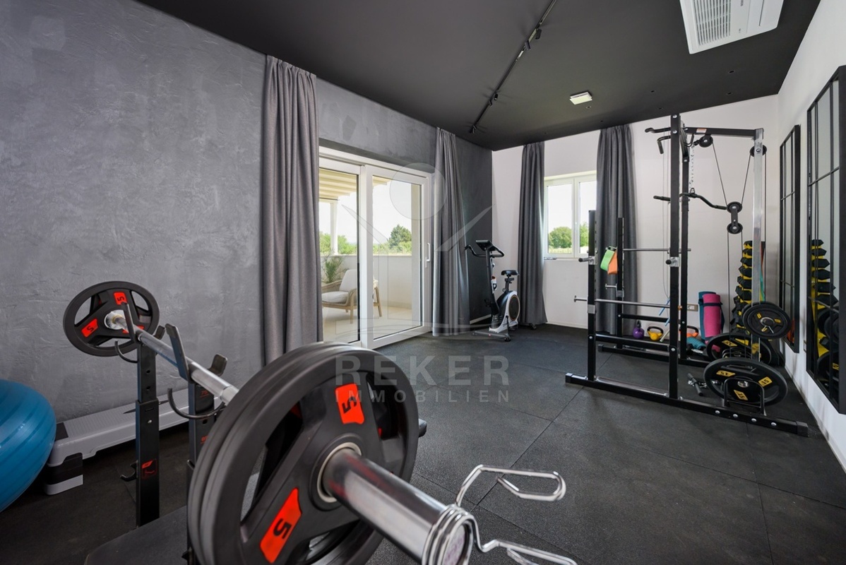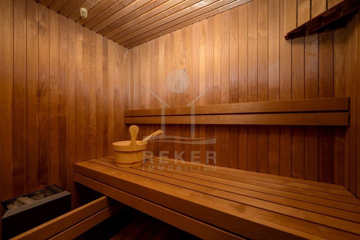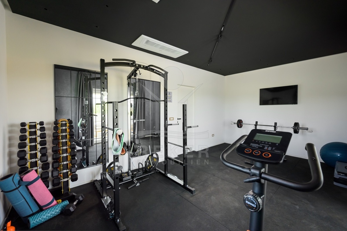 Das Obergeschoss bietet zwei weitere Schlafzimmer mit en-suite Bad. Ergänzt wird es durch einen Fitnessraum mit modernen Geräten, eine Sauna und ein zusätzliches Bad. Der überdachte Balkon mit Blick ins Grüne lädt zum Entspannen ein. Alle Räume sind stilvoll eingerichtet und entsprechen hohen Standards.