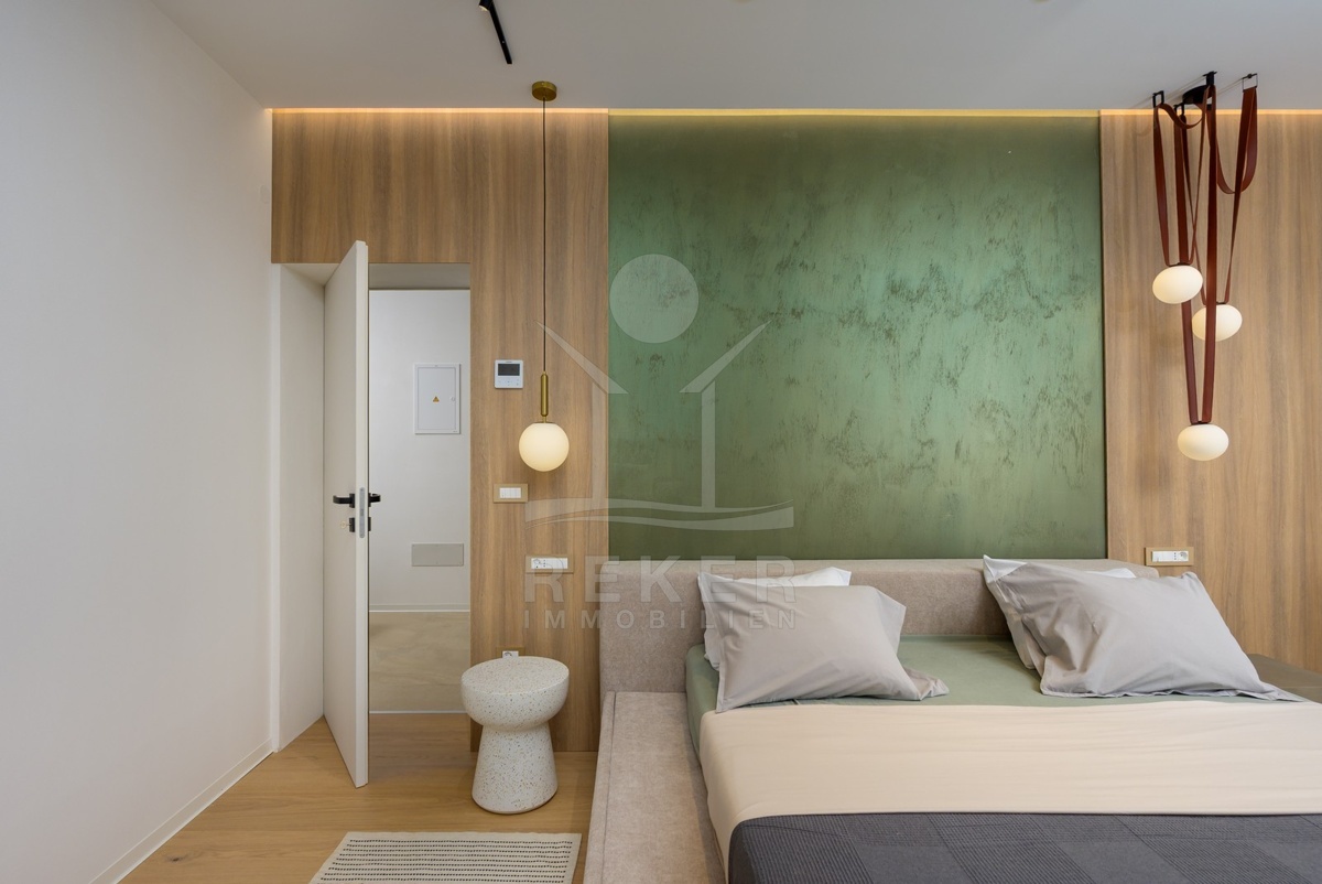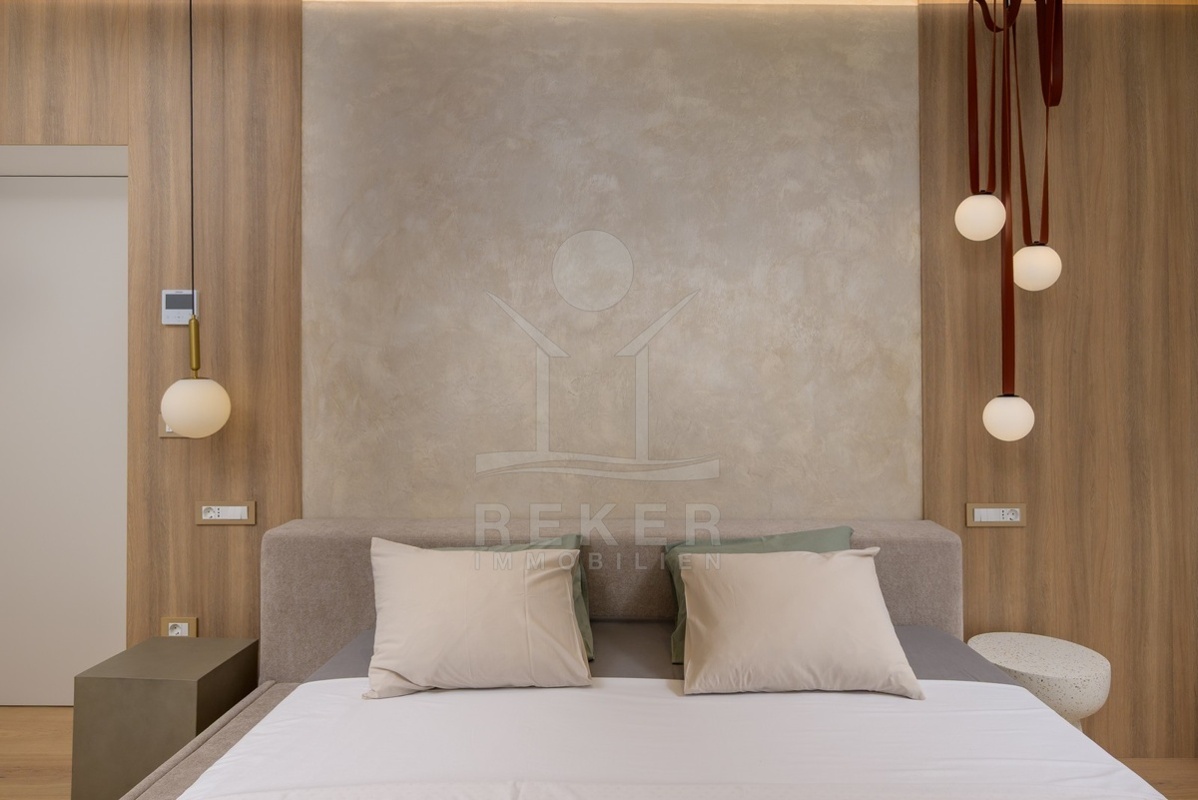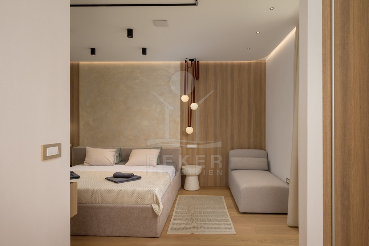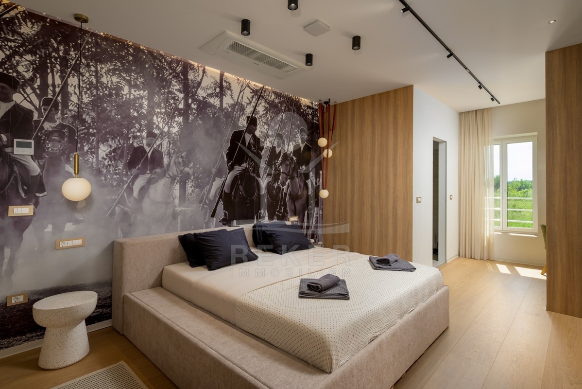 Das Obergeschoss bietet zwei weitere Schlafzimmer mit en-suite Bad. Ergänzt wird es durch einen Fitnessraum mit modernen Geräten, eine Sauna und ein zusätzliches Bad. Der überdachte Balkon mit Blick ins Grüne lädt zum Entspannen ein. Alle Räume sind stilvoll eingerichtet und entsprechen hohen Standards.