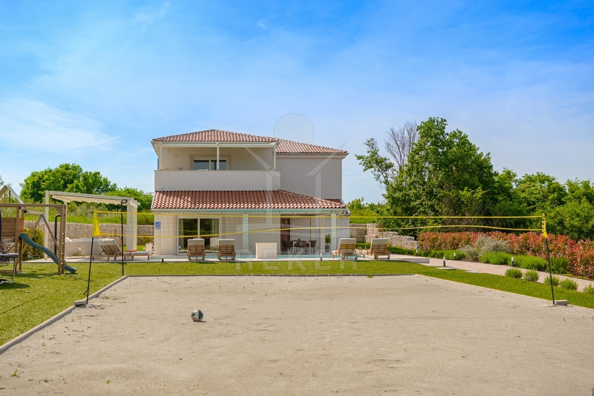 Der Außenbereich ist ein echtes Highlight. Ein großzügiger Pool mit Tief- und Flachbereich, beheizbar oder kühlbar, sorgt für Badefreude von Frühjahr bis Herbst. Ein integrierter Fall lässt sich direkt vom Pool aus steuern. Rundherum erwarten Sie Sonnenterrassen, eine überdachte Sitzecke und eine gepflegte Liegewiese. Für Sport und Spaß gibt es einen Beachvolleyballplatz, einen Spielplatz mit Schaukel und Rutsche sowie ein Trampolin. Besonders für Familien ein Pluspunkt.