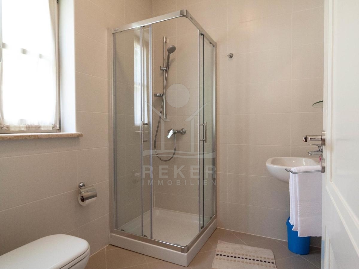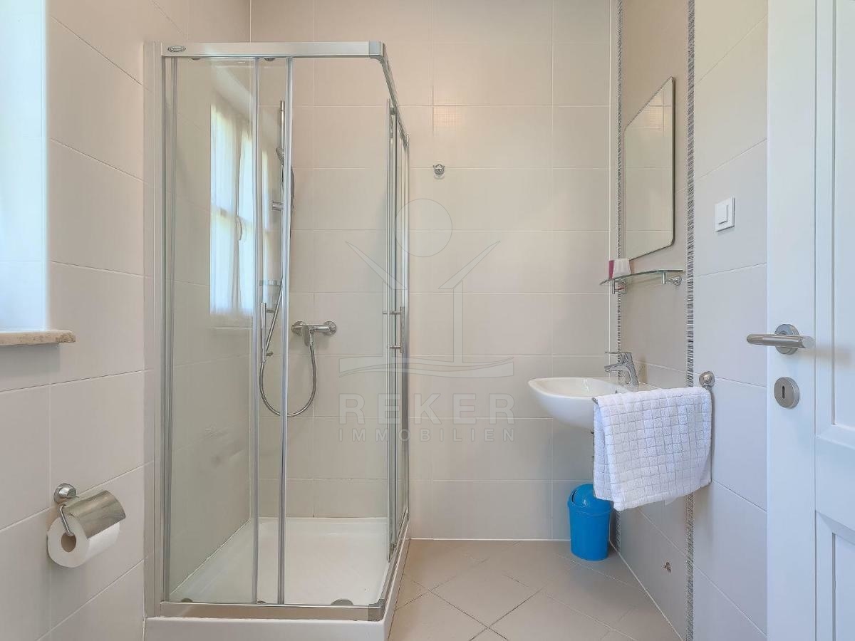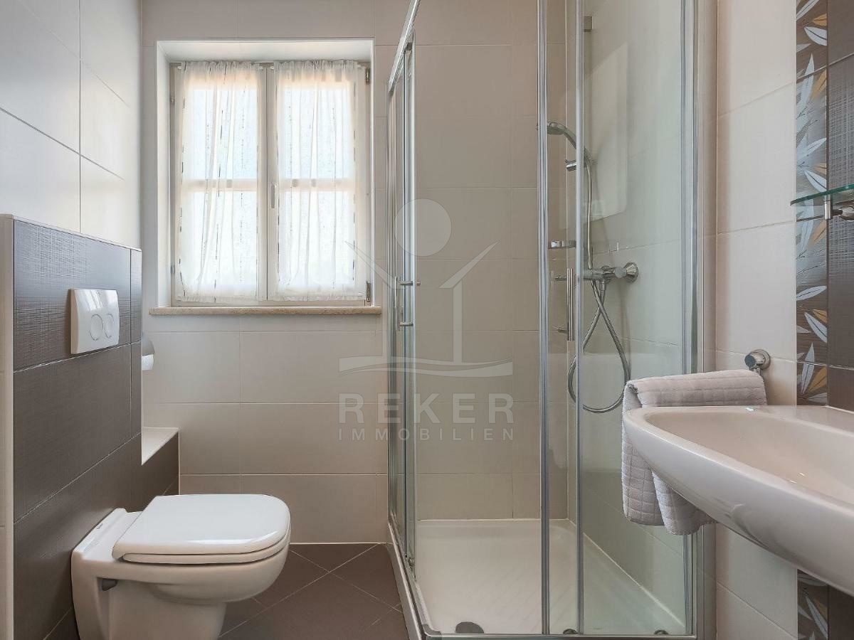 Das Erdgeschoss der Villa besticht durch einen offenen und einladenden Wohnbereich, bestehend aus einem gemütlichen Wohnzimmer, einem stilvollen Esszimmer und einer modernen Küche. Ergänzt wird dieser Bereich durch ein komfortables Schlafzimmer mit eigenem Bad – ideal für Gäste oder den Hauptwohnbereich.