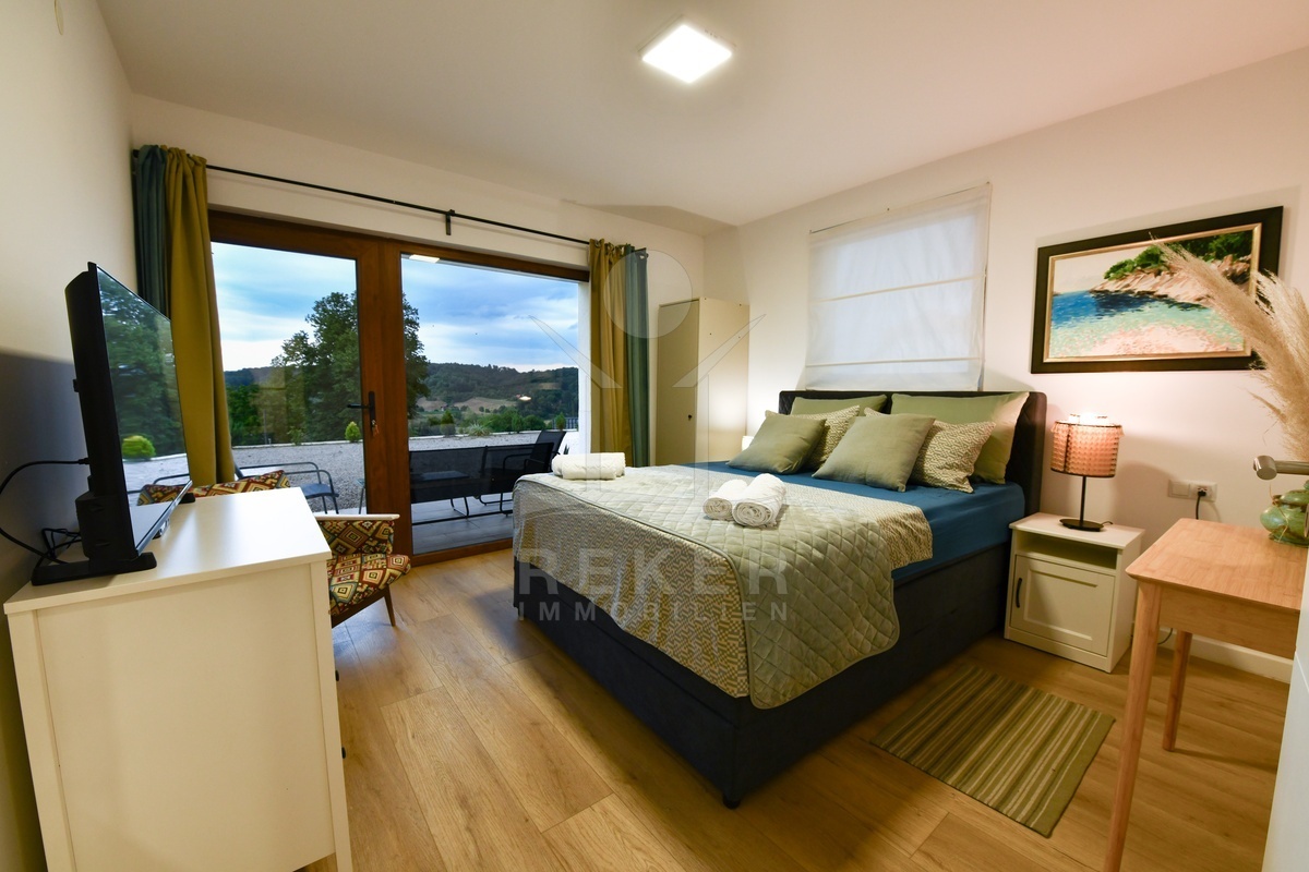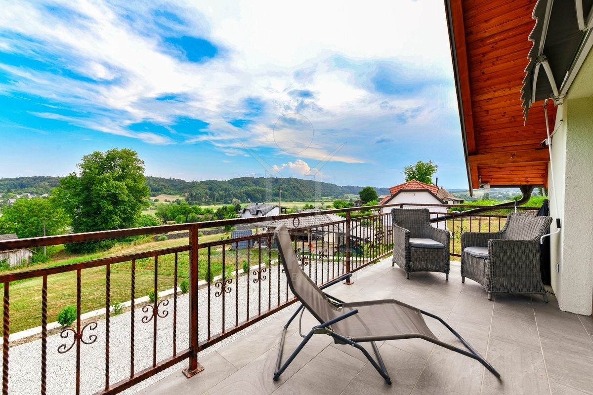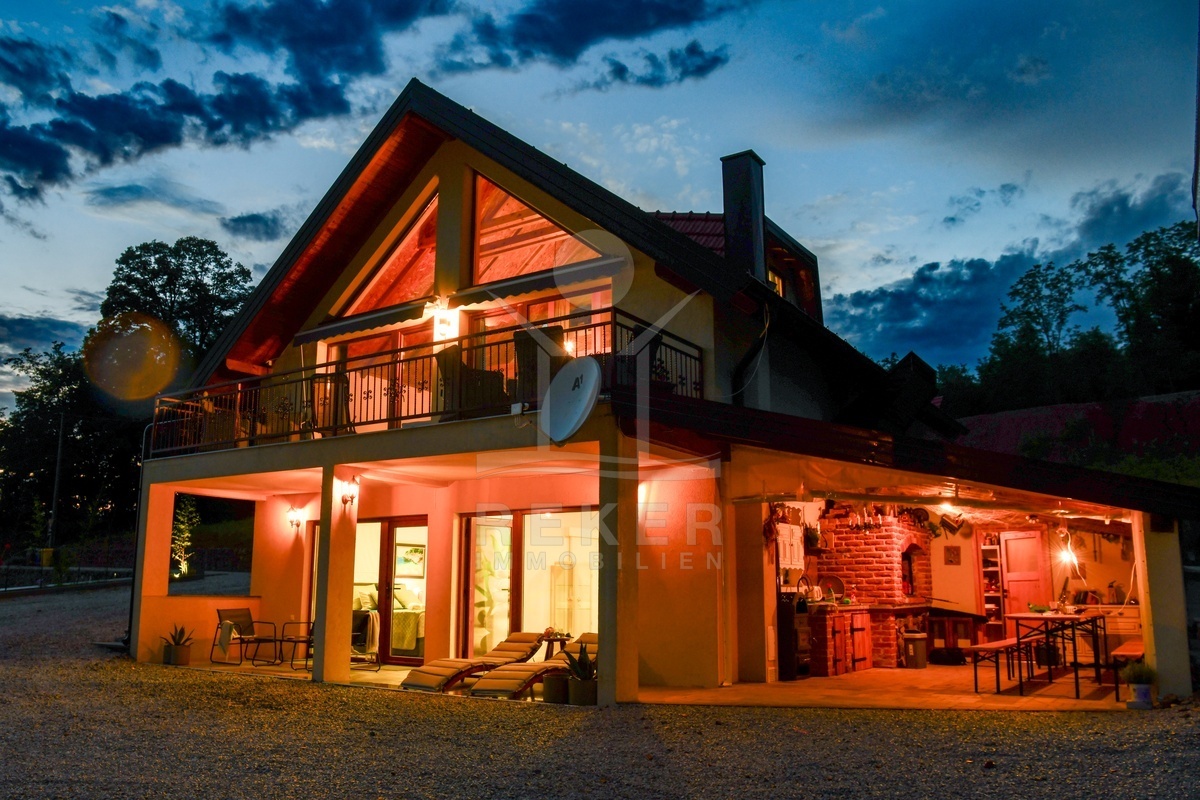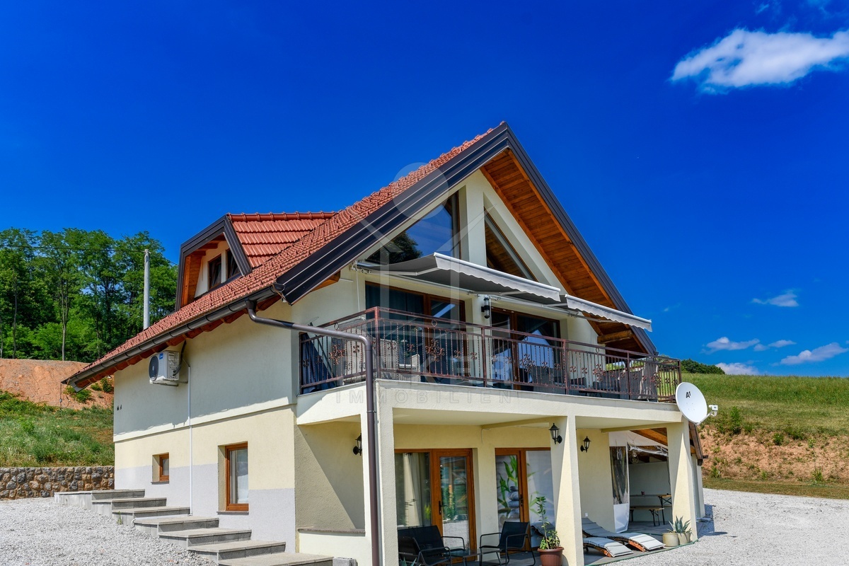Dieses moderne Einfamilien- und Ferienhaus befindet sich in der Gemeinde Barilović, umgeben von viel Grün, nur rund 650 m vom Fluss Korana entfernt und etwa 15 km von Karlovac. Ruhe und Natur treffen hier auf eine praktische Erreichbarkeit des täglichen Bedarfs. Der asphaltierte Zugang und der überdachte Parkplatz erleichtern den Alltag und sorgen auch während der Ferien für ein entspanntes Ankommen.