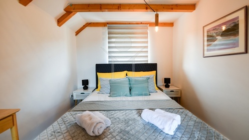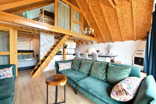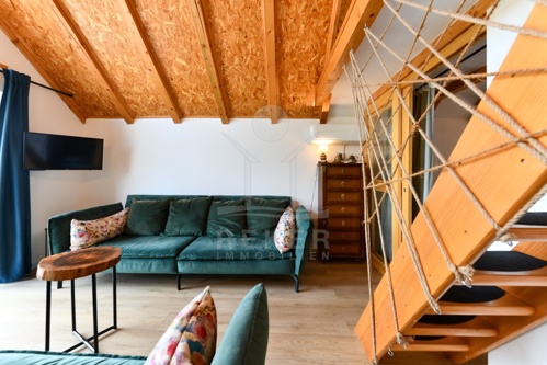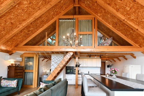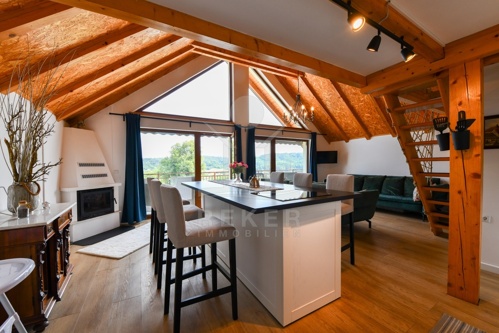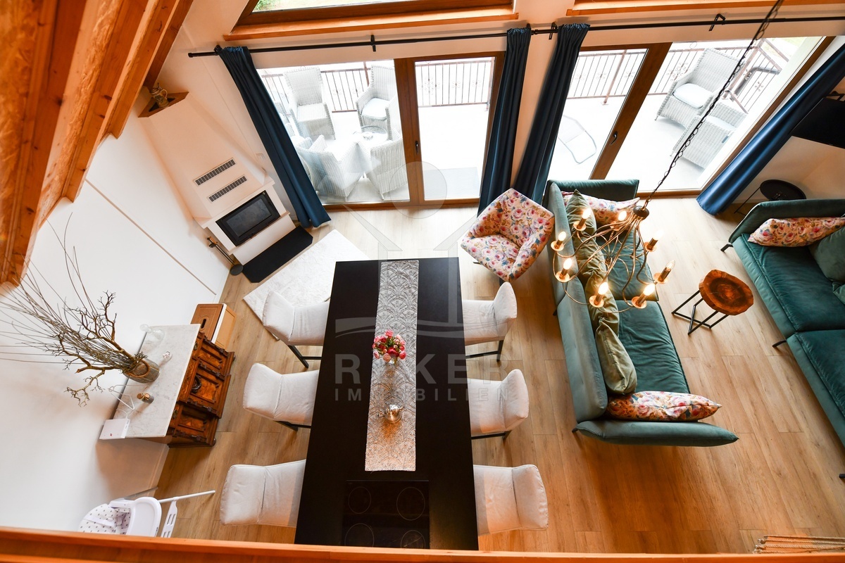 Der erste Stock bildet den Mittelpunkt des Hauses. Küche, Essplatz und Wohnzimmer sind offen angelegt und wirken großzügig. Ein weiteres Schlafzimmer sowie ein Badezimmer ergänzen diese Etage. Vom Wohnbereich aus gelangen Sie auf den Balkon mit Blick ins Grüne, der das naturnahe Wohnen unterstreicht. Im zweiten Obergeschoss schafft eine Galerie mit zusätzlichem Schlafzimmer flexible Nutzungsmöglichkeiten für Familie oder Gäste.