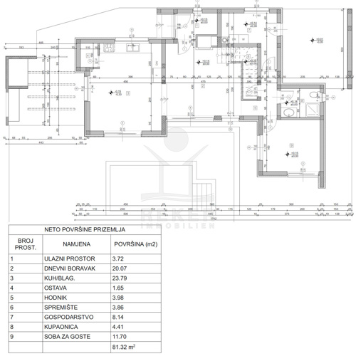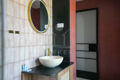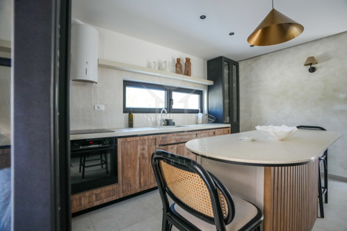 Die Villa wird vollständig möbliert verkauft und bietet ein durchdachtes Raumkonzept für höchsten Komfort. Im Erdgeschoss erstreckt sich die Wohnfläche über 81,32 m², mit einem offenen Wohnbereich, Küche und Esszimmer, die Zugang zur Terrasse und dem Pool bieten. Ein Gästezimmer, ein Badezimmer und ein Wirtschaftsraum ergänzen diese Etage.