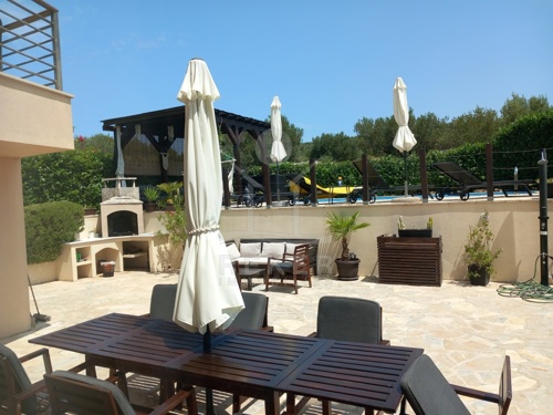 Der Außenbereich punktet mit viel Platz und Privatsphäre. Im Mittelpunkt steht der beheizte Keramikpool, eingefasst von einer Natursteinfläche und einem dichten, grünen Zaun mit automatischer Bewässerung. Rundherum: Sonnenliegen, ein gemauerter Kamin, ein schattiger Sitzplatz unter Holzpergola und ein kleines Gartenhaus. Der gesamte Hof ist pflegeleicht angelegt – mit Steinplatten und Kunstrasen.