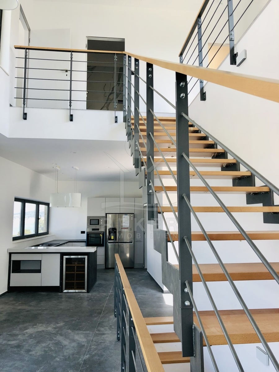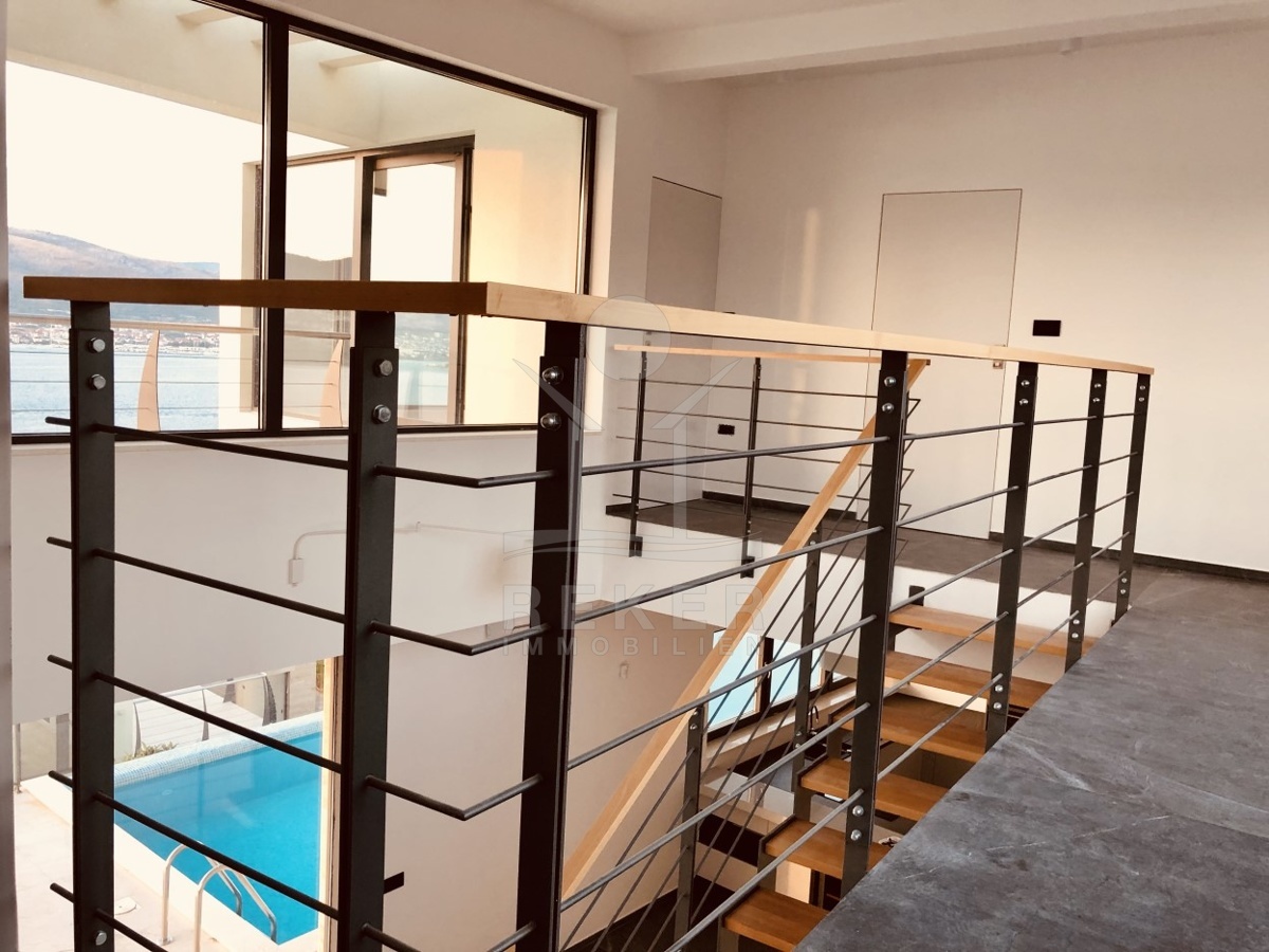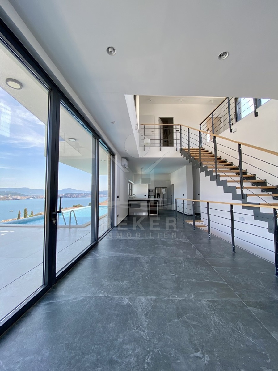 Das Anwesen erstreckt sich über zwei Etagen und bietet eine Wohnfläche von 361 m². Auf einem Grundstück von 701 m² am Hang gelegen, bietet sie einen wunderschönen Blick auf das Meer. Beim Bau wurden ausschließlich hochwertige Materialien verwendet, darunter großformatige Keramikfliesen, Massivholzböden und rahmenlose Innentüren, die den hohen Räumen zusätzliche Akzente verleihen. Das Haus ist zudem unterkellert und bietet somit zusätzlichen Stauraum.