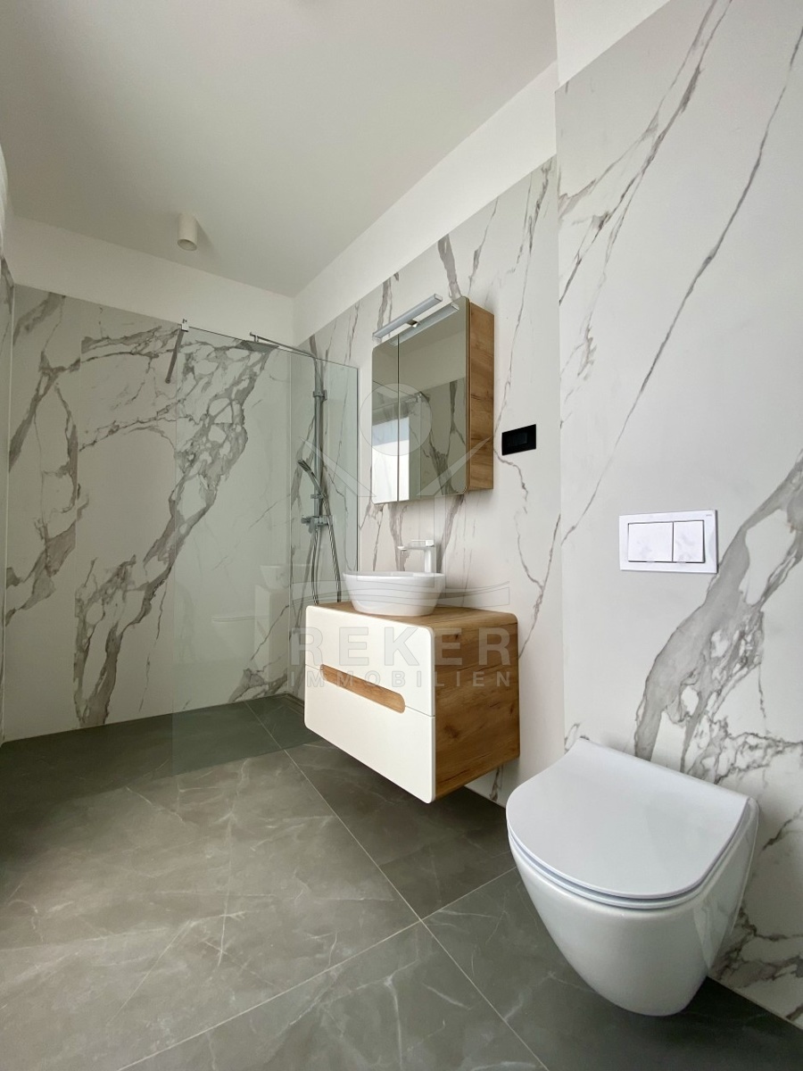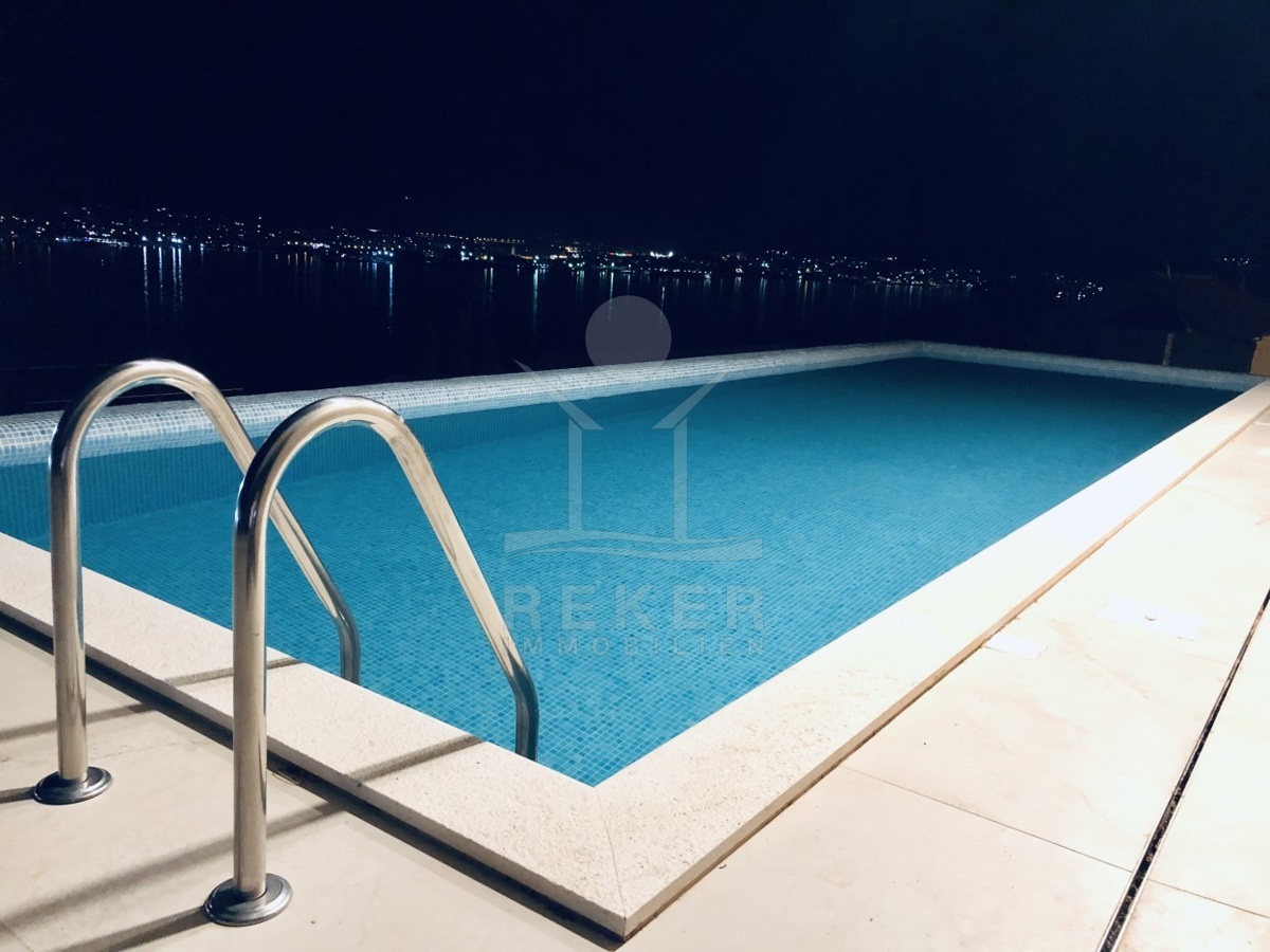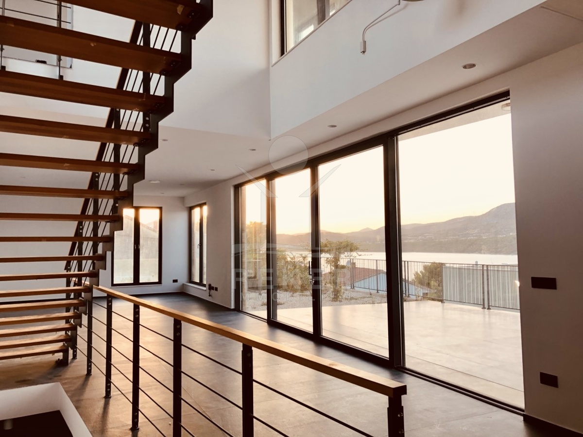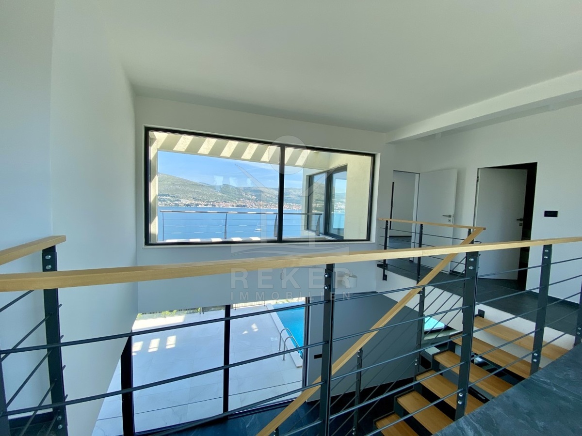 Das Anwesen erstreckt sich über zwei Etagen und bietet eine Wohnfläche von 361 m². Auf einem Grundstück von 701 m² am Hang gelegen, bietet sie einen wunderschönen Blick auf das Meer. Beim Bau wurden ausschließlich hochwertige Materialien verwendet, darunter großformatige Keramikfliesen, Massivholzböden und rahmenlose Innentüren, die den hohen Räumen zusätzliche Akzente verleihen. Das Haus ist zudem unterkellert und bietet somit zusätzlichen Stauraum.
