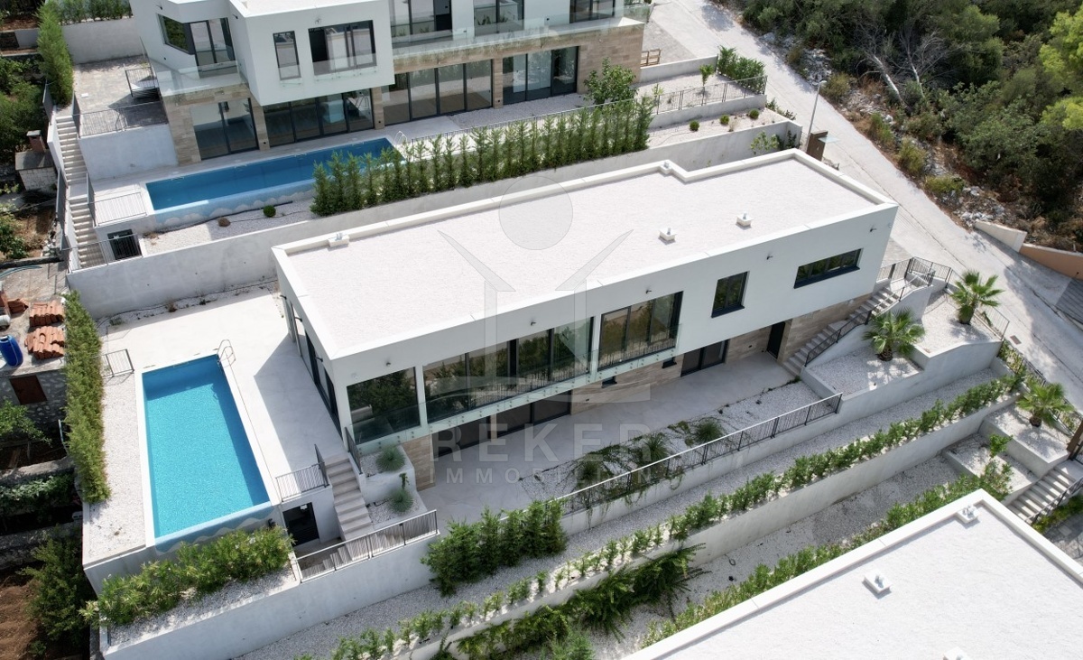 Die Außenseite der Villa bietet zwei geräumige Terrassen mit Blick auf das Meer. Ein wunderbarer, beheizter Pool sorgt für Erfrischung und Entspannung an sommerlichen Tagen. Der Pool ist vollautomatisch, beheizt mit einer Luftwärmepumpe und mit Umkehrosmose-Reinigungstechnologie ausgestattet. Tauchen Sie ein in das herrliche Sommerfeeling und entspannen Sie sich auf dieser einzigartigen Terrasse. Diese moderne Villa bietet Ihnen Luxus und Entspannung in einer atemberaubenden Umgebung.