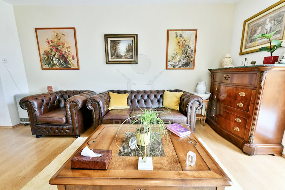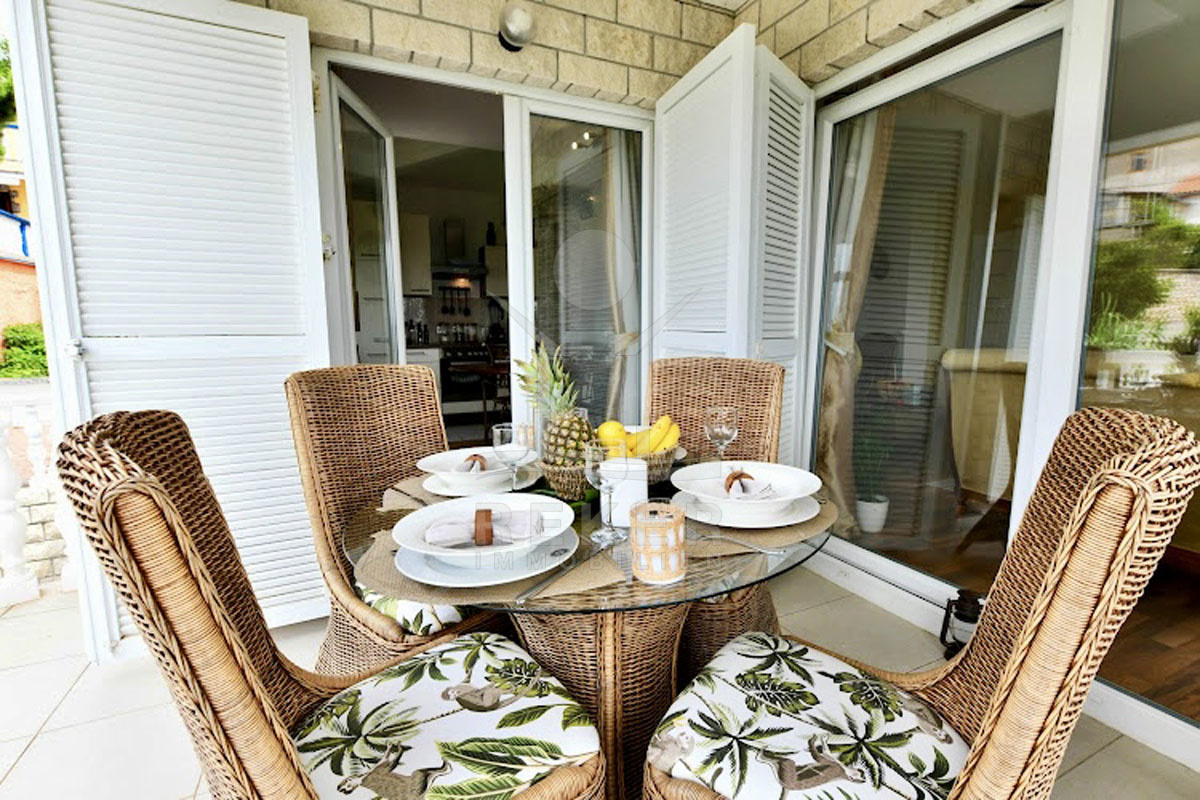 Die Wohnungen sind im klassischen Stil gehalten, mit eleganten britischen und italienischen Möbeln und Dekorationen, die für ein luxuriöses Ambiente sorgen. Die genaue Möblierung kann individuell nach Vereinbarung erworben werden. Die Wohnung Nr. 1 im Erdgeschoss mit einer Gesamtwohnfläche von 113,77 m² besteht aus offenem Wohn-, Ess- und Küchenbereich mit Zugang auf die überdachten Terrassen. Eine Garage, 2 Schlafzimmern und 1 Badezimmer runden das Angebot ab.