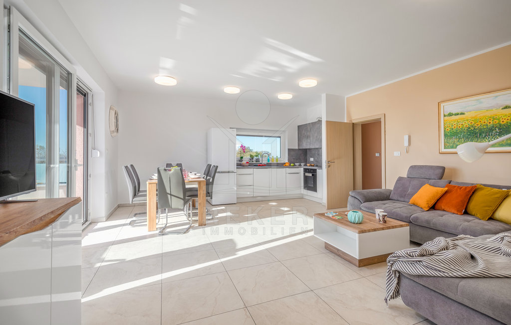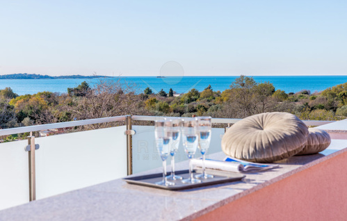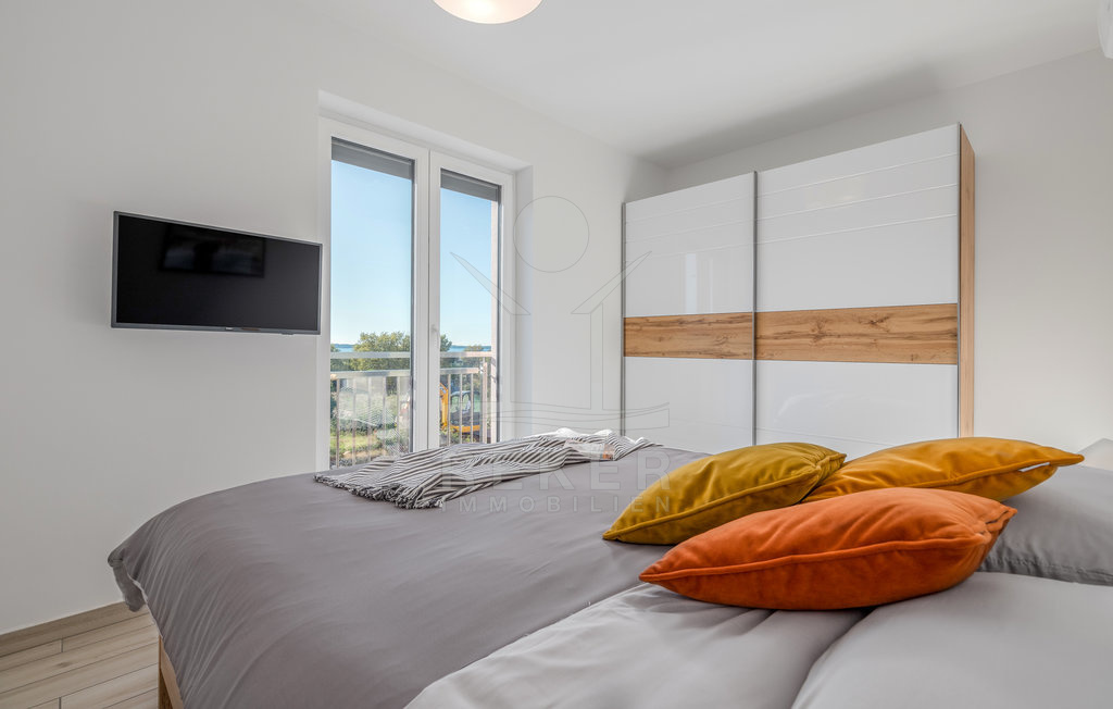 Das Apartment im ersten Stock spiegelt den Grundriss und die Gestaltung des Erdgeschosses wider. Es bietet eine harmonische Mischung aus Komfort und Stil. Das Wohnzimmer öffnet sich zu einem großzügigen Balkon mit atemberaubendem Meerblick, während die Schlafzimmer jeweils über einen eigenen französischen Balkon verfügen. Hier erwartet Sie Luxus und Entspannung.