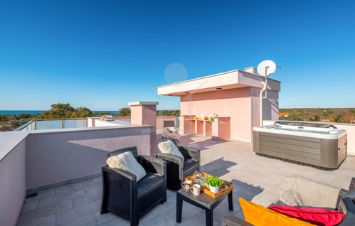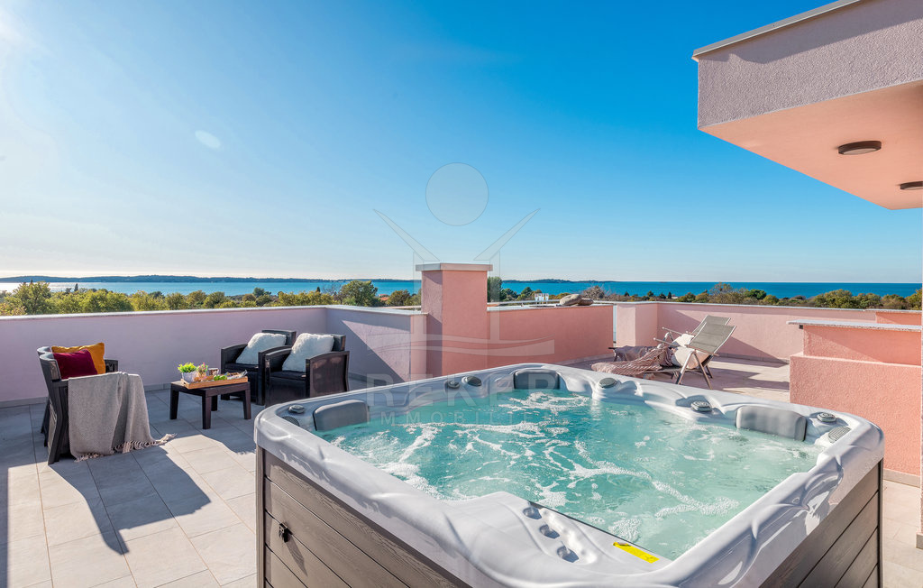 Genießen Sie den Luxus einer weitläufigen und sonnenverwöhnten Dachterrasse in der obersten Etage mit einem faszinierenden Meerblick. Dieser Raum verfügt zudem über einen Whirlpool, der eine Oase der Entspannung und Ruhe schafft. Hier können Sie den Blick auf das Meer genießen und den Alltag hinter sich lassen.