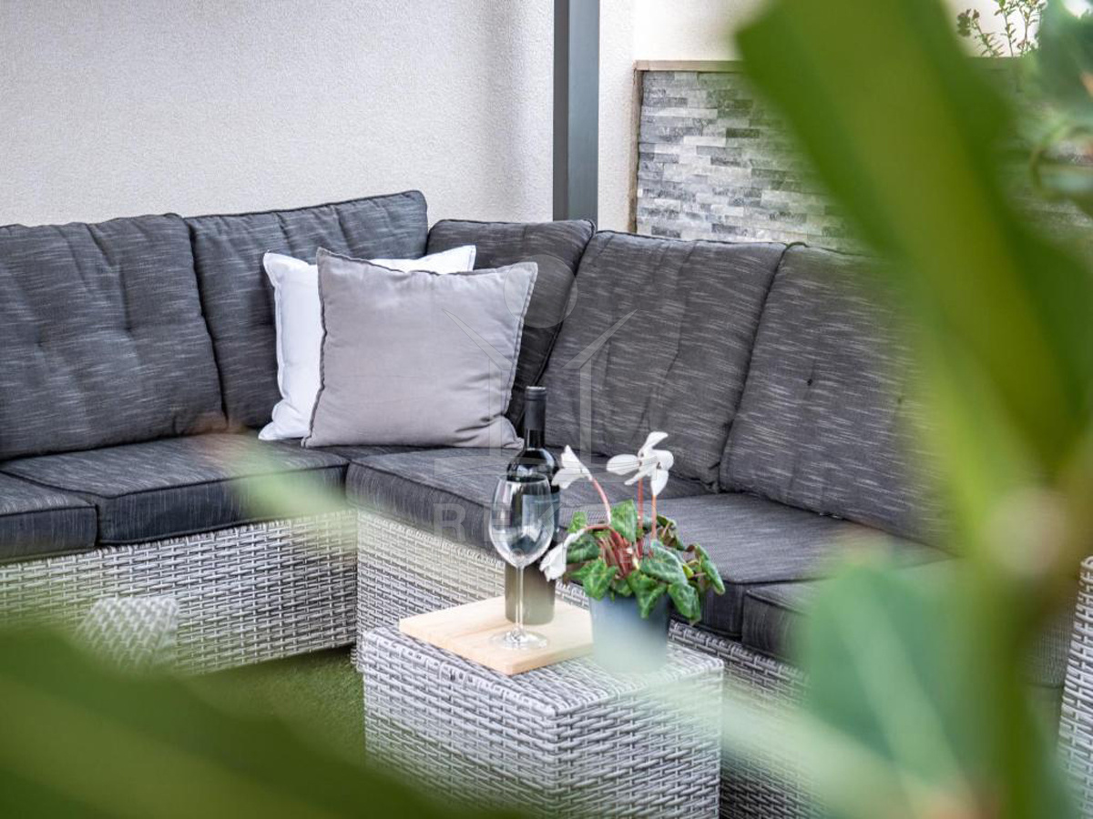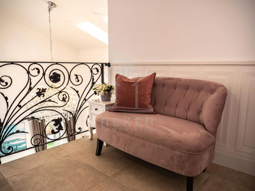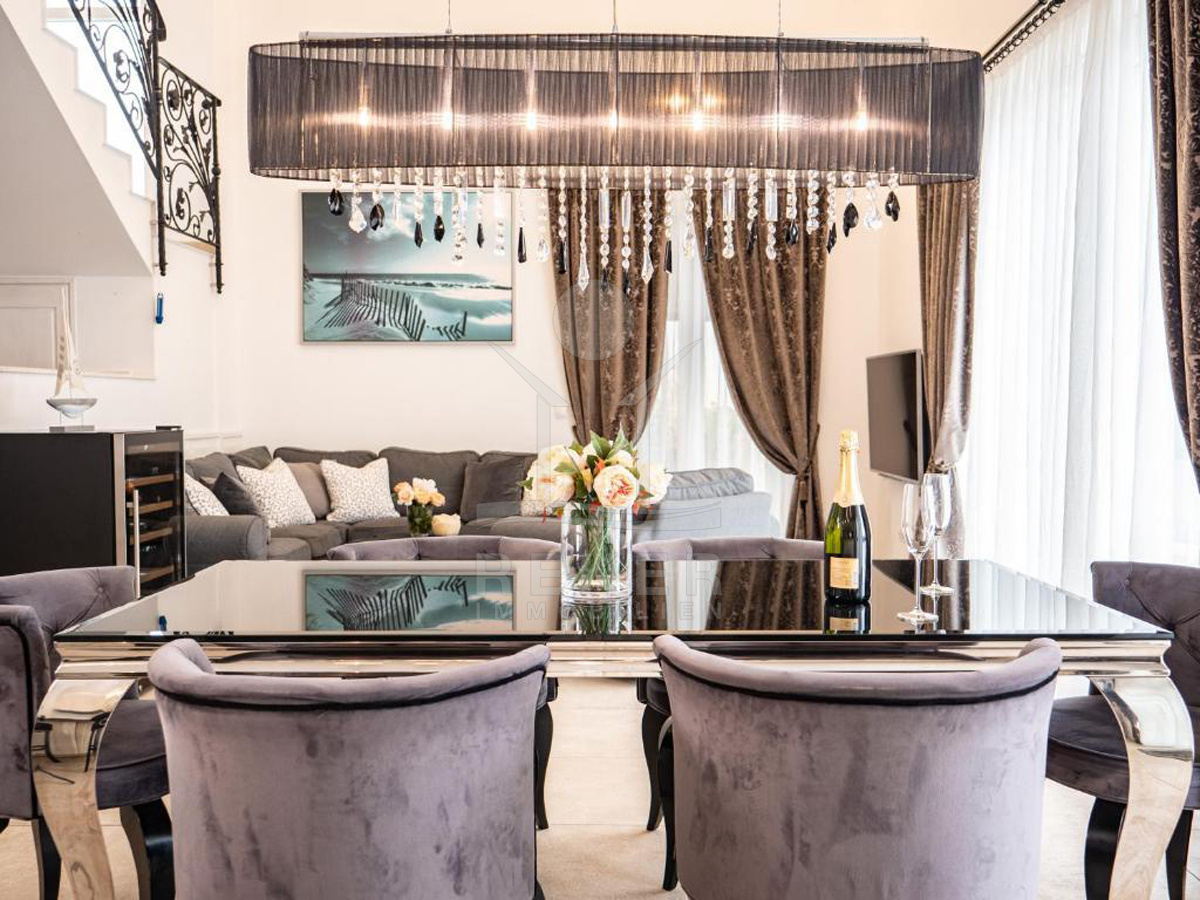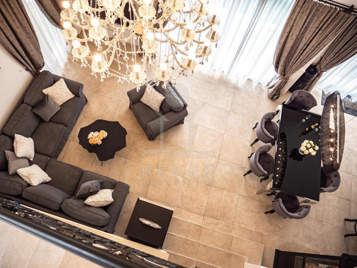 Im Inneren verteilt sich die Wohnfläche über zwei Etagen. Der Wohn- und Essbereich ist offen gestaltet, lichtdurchflutet und elegant eingerichtet. Warme Töne, samtige Polsterstühle und ein gläserner Esstisch mit Blick zur Terrasse setzen den Ton. Der Wohnbereich geht fließend in die Küche über. Edle Fliesen, ein Kronleuchter, große Fensterflächen – alles ist auf Atmosphäre ausgelegt.