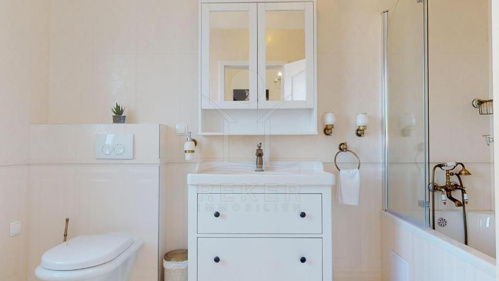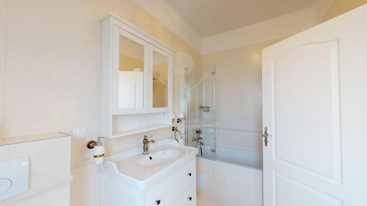Insgesamt gibt es drei Schlafzimmer – jedes mit eigenem Stil und großzügigem Schnitt. Dazu vier Bäder, alle hell und mit hochwertigen Armaturen ausgestattet. Vom Obergeschoss gelangen Sie auf den Balkon mit herrlichem Ausblick über die Umgebung – ein idealer Platz für einen ruhigen Morgenkaffee.