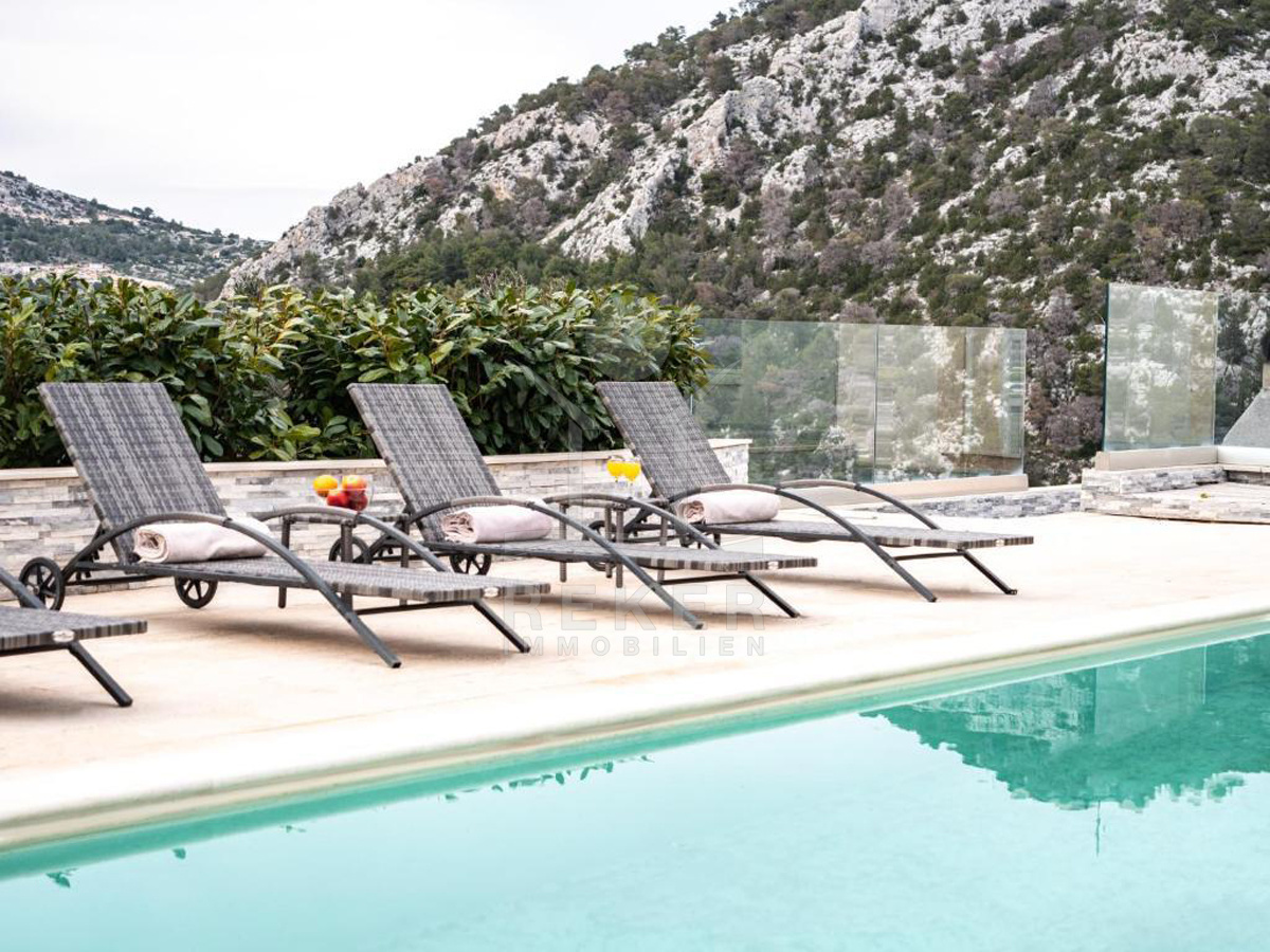 Der Außenbereich ist ein echtes Highlight. Der private Pool ist von einer hellen Steinterrasse umgeben – mit Sonnenliegen, Essbereich und viel Privatsphäre. Mediterrane Pflanzen sorgen für ein entspanntes Urlaubsgefühl. Auf der Terrasse können Sie frühstücken, grillen oder einfach die Sonne genießen. Auch vom Pool aus genießen Sie den Ausblick auf die umliegenden Hügel – perfekt für eine Auszeit zwischendurch.