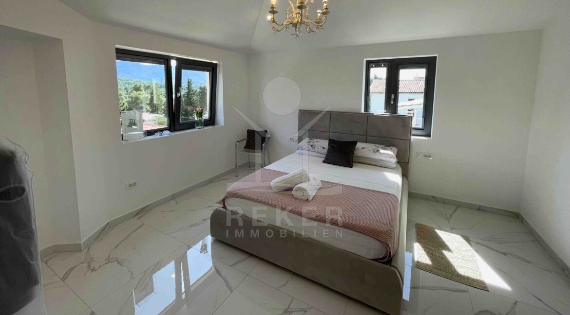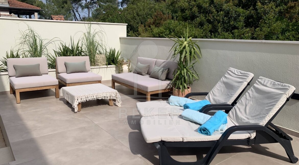 Die Innentreppe führt in den 1. Stock, wo 3 helle Schlafzimmer mit eigenem Bad auf Sie warten. Von dieser Etage aus genießen Sie einen herrlichen Blick auf die Bucht und den angrenzenden Pinienwald – ideal für entspannende Momente.