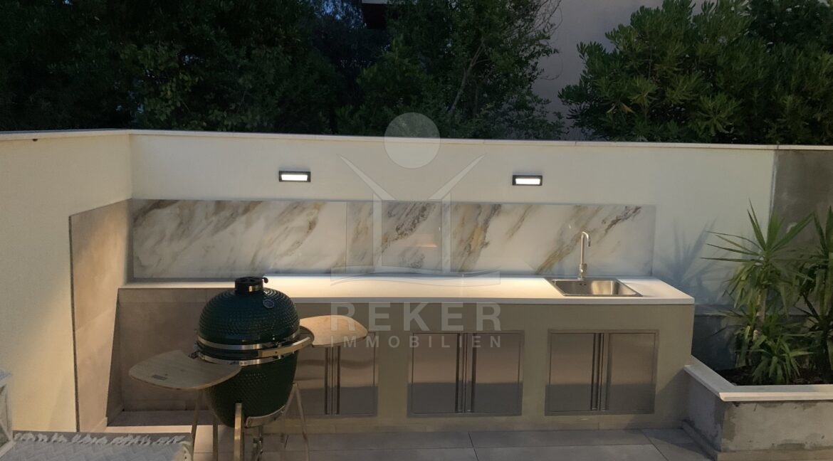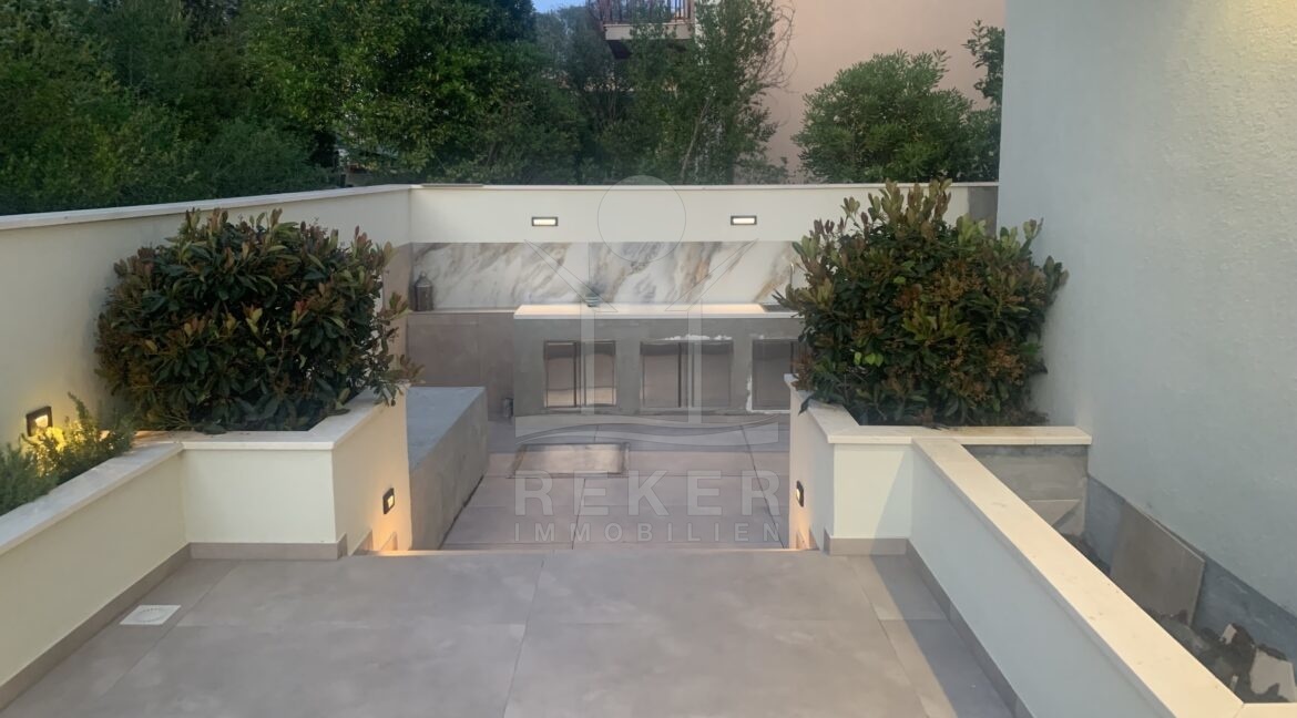 Die geplante Terrasse wird eine erstklassige Außenanlage mit einem Salzwasserpool erhalten, der sowohl Komfort als auch Luxus verspricht. Ein Wasserenthärter macht das Wasser angenehm und sanft, während die Kombination aus Salz und Sonnenstrahlen ein zusätzliches Wohlfühlklima schafft. Diese Oase im Freien wird der perfekte Ort sein, um die warmen Sommertage und entspannten Abende zu genießen, und fügt sich nahtlos in die elegante Gesamtästhetik dieser einzigartigen Villa ein.