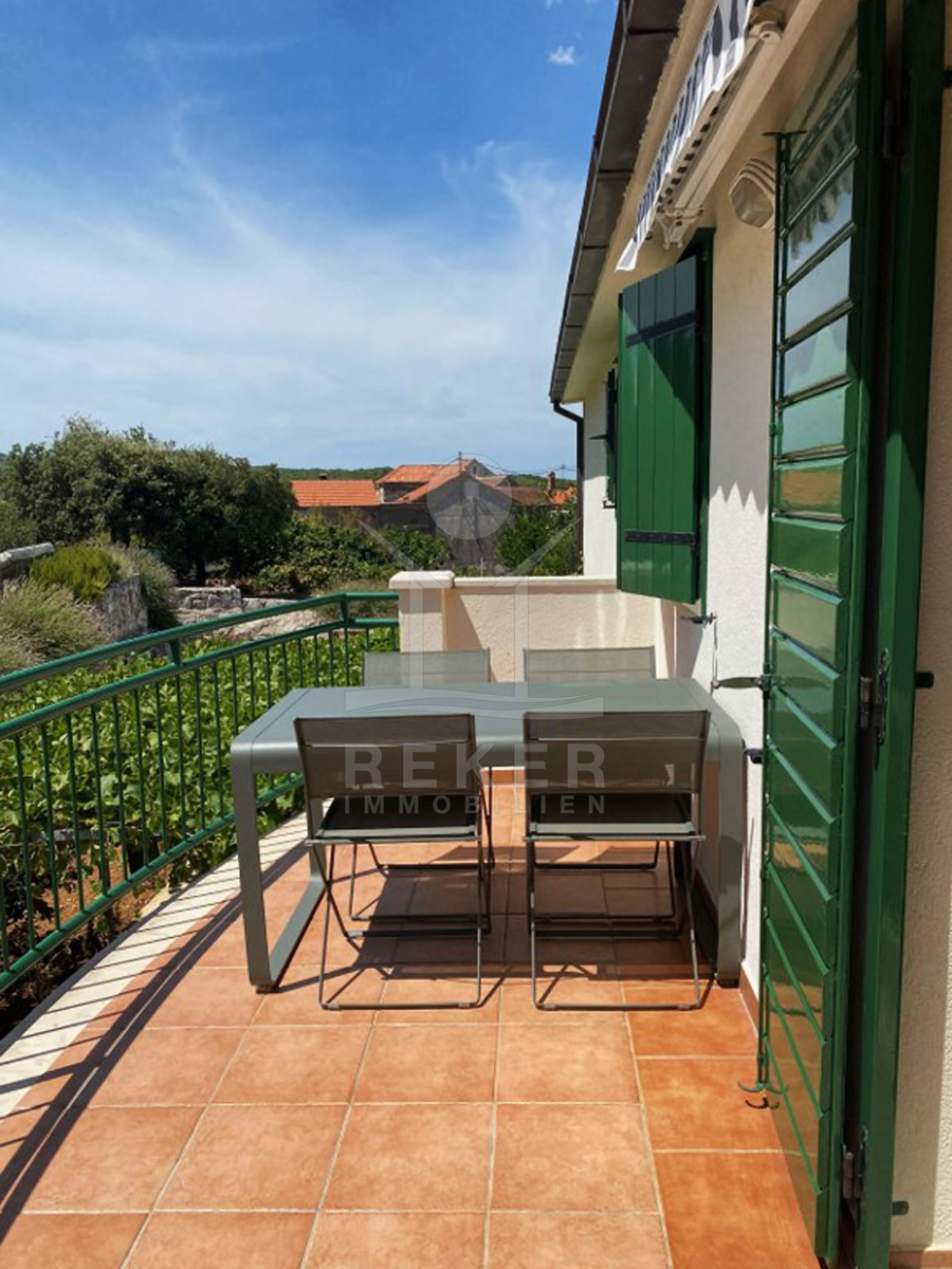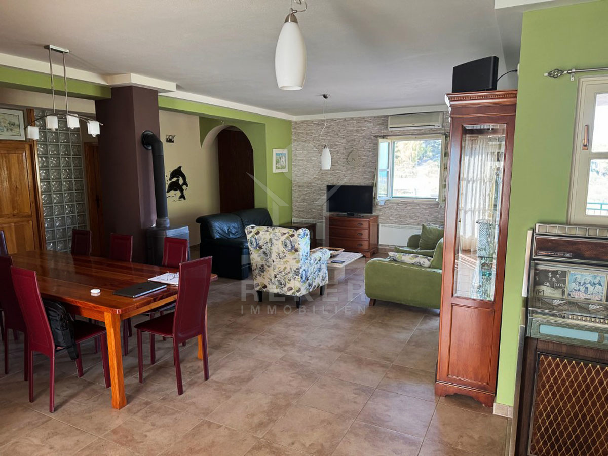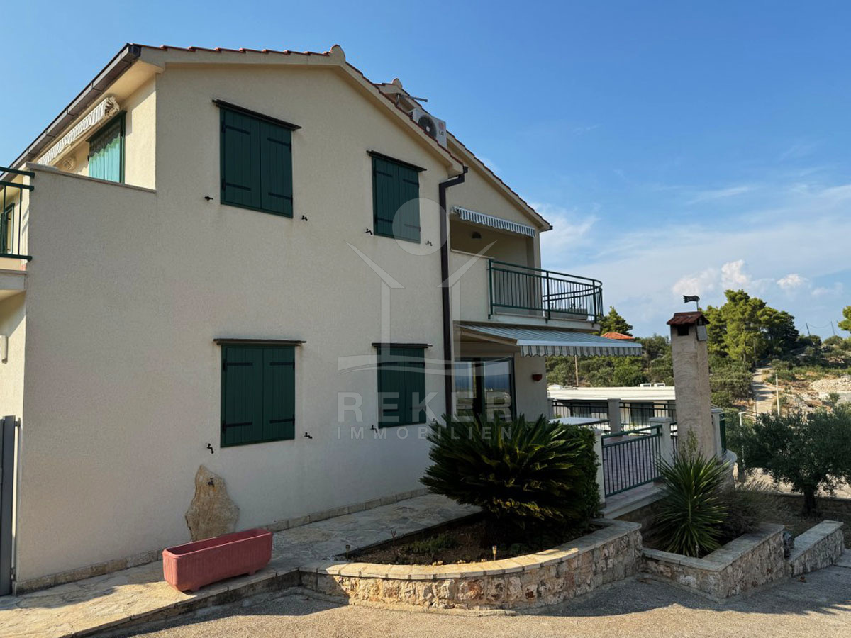 Die Villa erstreckt sich über 1.000 m² auf den malerischen Hängen eines Hügels und bietet einen phänomenalen Blick auf das glitzernde Meer, umgeben von Olivenhaine, Weinberge und duftende Lavendelfelder. Die mediterrane Gartengestaltung mit sorgfältig ausgewählten Pflanzen wie Mandarinen, Zitronen, Orangen, etwas Oliven, Lavendel und Rosmarin verleiht der Immobilie ein außergewöhnliches Flair. Das 262 m² große Gebäude, das im Jahr 2004 erbaut wurde, lässt keine Wünsche offen und bietet sowohl eine direkte Zufahrt als auch zwei Garagen von ca. 45 m² neben der Straße sowie einen überdachten Parkplatz.