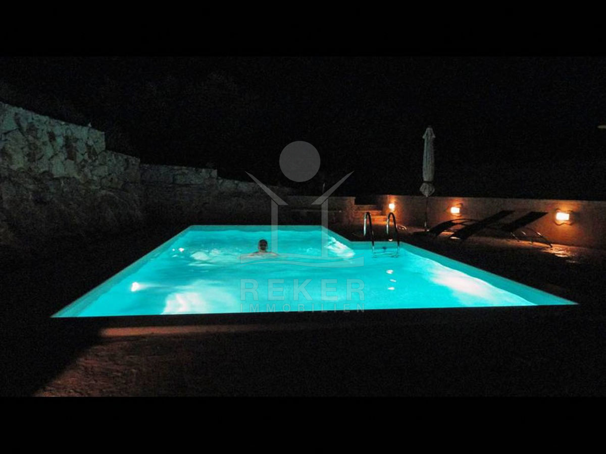 Der Außenbereich der Villa ist großzügig gestaltet und strahlt einen mediterranen Charme aus, mit einem beheizten Pool, der durch Solarkollektoren unterstützt wird. Der 320-Liter-Boiler befindet sich unter der Treppe und gewährleistet angenehme Wassertemperaturen. Direkt neben dem Pool befindet sich der Poolmaschinenraum, der geschickt mit einer kleinen Weinstube kombiniert ist. Zusätzliche Annehmlichkeiten wie ein Steingrill und schattige Sitzplätze laden dazu ein, die herrlichen Außenanlage zu genießen. Hier können Sie entspannen, feiern oder einfach die wunderschöne Umgebung in vollen Zügen bewundern– ein wahres Paradies für jeden Liebhaber des mediterranen Lebensstils!