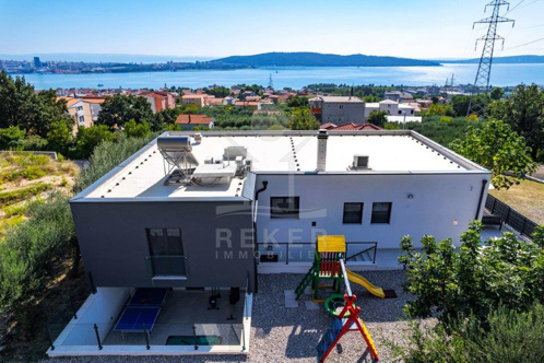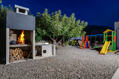 Die Außenanlage der Villa ist großzügig gestaltet und bietet einen atemberaubenden Meerblick. Ein beheizter Pool lädt zum Schwimmen und Entspannen ein, während die Liegefläche zum Sonnenbaden ein perfekter Ort für entspannende Tage im Freien ist. Ein überdachter Bereich mit einem modernen Außenkamin/ Steingrill vervollständigt das Gesamtbild und schafft einen einladenden Rahmen für gesellige Abende mit Familie und Freunden.