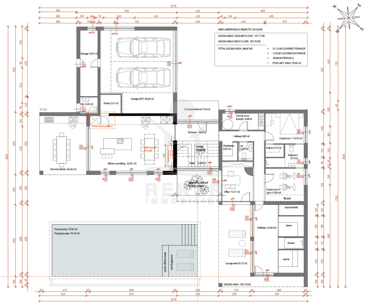 Die Villa bietet rund 395 m² Wohnfläche ohne Terrassen und befindet sich in einer fortgeschrittenen Rohbauphase. Sie entscheiden über Materialien, Ausstattung und Details. Im Erdgeschoss empfängt Sie ein 42,40 m² großer Wohnbereich mit Küche und Essplatz. Von hier gelangen Sie direkt auf die Terrasse. Zwei Schlafzimmer, ein Badezimmer sowie ein Büro mit Option auf ein weiteres Schlafzimmer ergänzen diese Ebene. Zusätzlich stehen Ihnen ein Wellnessbereich mit Sauna und Dusche, ein Technikraum, eine Garderobe und weitere Nebenräume zur Verfügung. Eine Struktur, die Familien und Gästen gleichermaßen Komfort bietet.