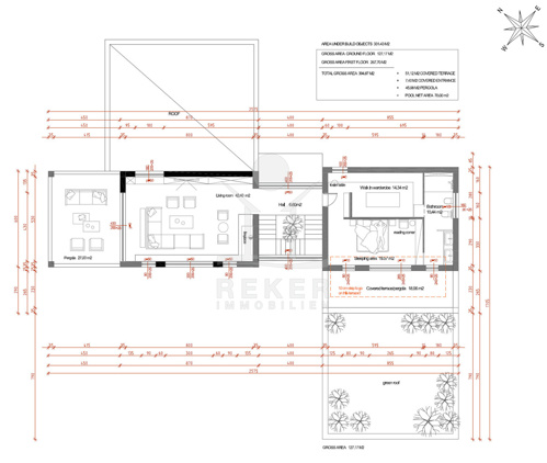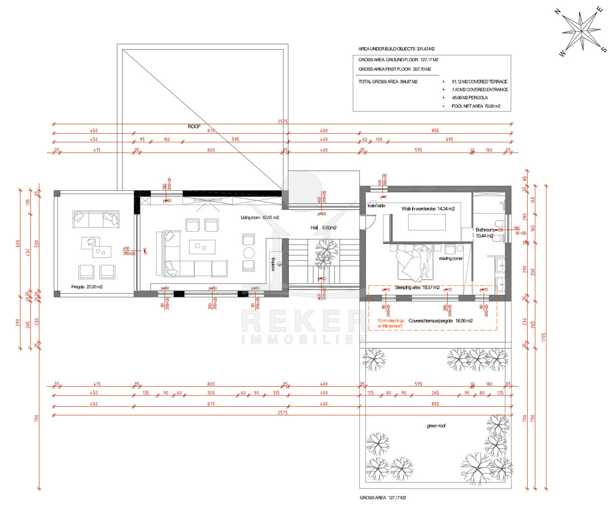 Im Obergeschoss steht die Aussicht im Mittelpunkt. Ein zweiter Wohnbereich mit 42,40 m² öffnet sich zur 27 m² großen Terrasse. Das Hauptschlafzimmer verfügt über eine eigene Ankleide und ein En-suite-Badezimmer. Von hier aus betreten Sie die überdachte Terrasse mit 18,06 m². Davor erstreckt sich ein begrüntes Dach, das die Atmosphäre angenehm ergänzt.