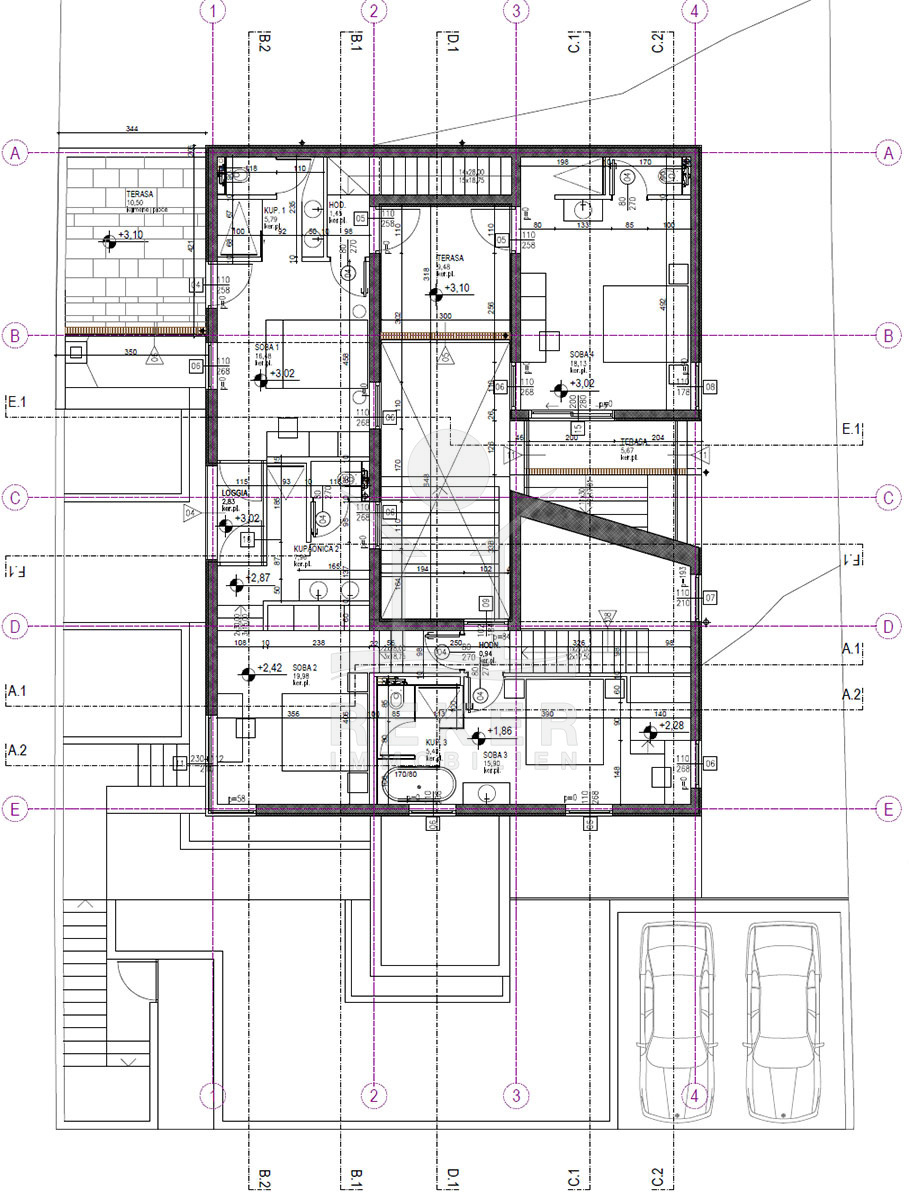 m Inneren öffnet sich ein großzügiger Wohnbereich mit Küche, Essplatz und Wohnzimmer. Große Glasflächen mit bis zu drei Metern Breite verbinden Innen- und Außenbereiche direkt. Deckenhöhen von bis zu sechs Metern schaffen Weite und Präsenz. Im Erdgeschoss befinden sich außerdem ein Gäste-WC sowie flexibel nutzbare Flächen. Diese eignen sich für einen Weinkeller, einen Wellness- oder einen Fitnessbereich. Im Obergeschoss gliedern sich zwei getrennte Flügel, jeweils über eigene Designertreppen erreichbar. Jeder Flügel umfasst zwei Schlafzimmer-Suiten mit eigenem Bad. Mehrere private Terrassen in unterschiedlichen Ausrichtungen erweitern die privaten Bereiche. Insgesamt stehen vier Schlafzimmer-Suiten zur Verfügung, drei davon mit direktem Terrassenzugang.