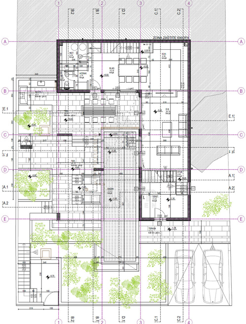 Der Zugang führt über ein Hoftor auf Straßenebene. Von dort gelangen Sie eine Etage höher auf die großzügige Hauptterrasse. Hier spielt sich das Leben im Freien ab. Infinity-Pool, Ess- und Loungezonen, eine geplante Außenküche sowie eine ebenerdige Dusche sind klar strukturiert. Dazu kommen Sonnen- und Ruhezonen. Der zweiseitig überlaufende Salzwasser-Infinity-Pool ist teilweise vom Baukörper überdeckt. Angenehmer Schatten inklusive. Die mediterrane Gartenanlage mit Olivenbäumen, Oleander, Agaven und ausgewählten Zierpflanzen ist pflegeleicht angelegt und vollautomatisch bewässert.