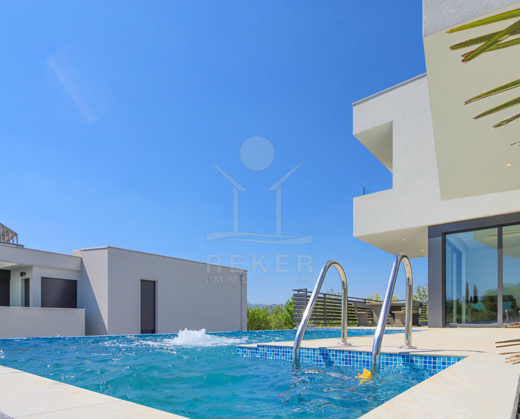 Das Highlight der Villa ist die beeindruckende Terrasse, die einen beheizten Infinity-Pool und gemütliche Liegeplätze umfasst, perfekt für entspannte Sommertage.