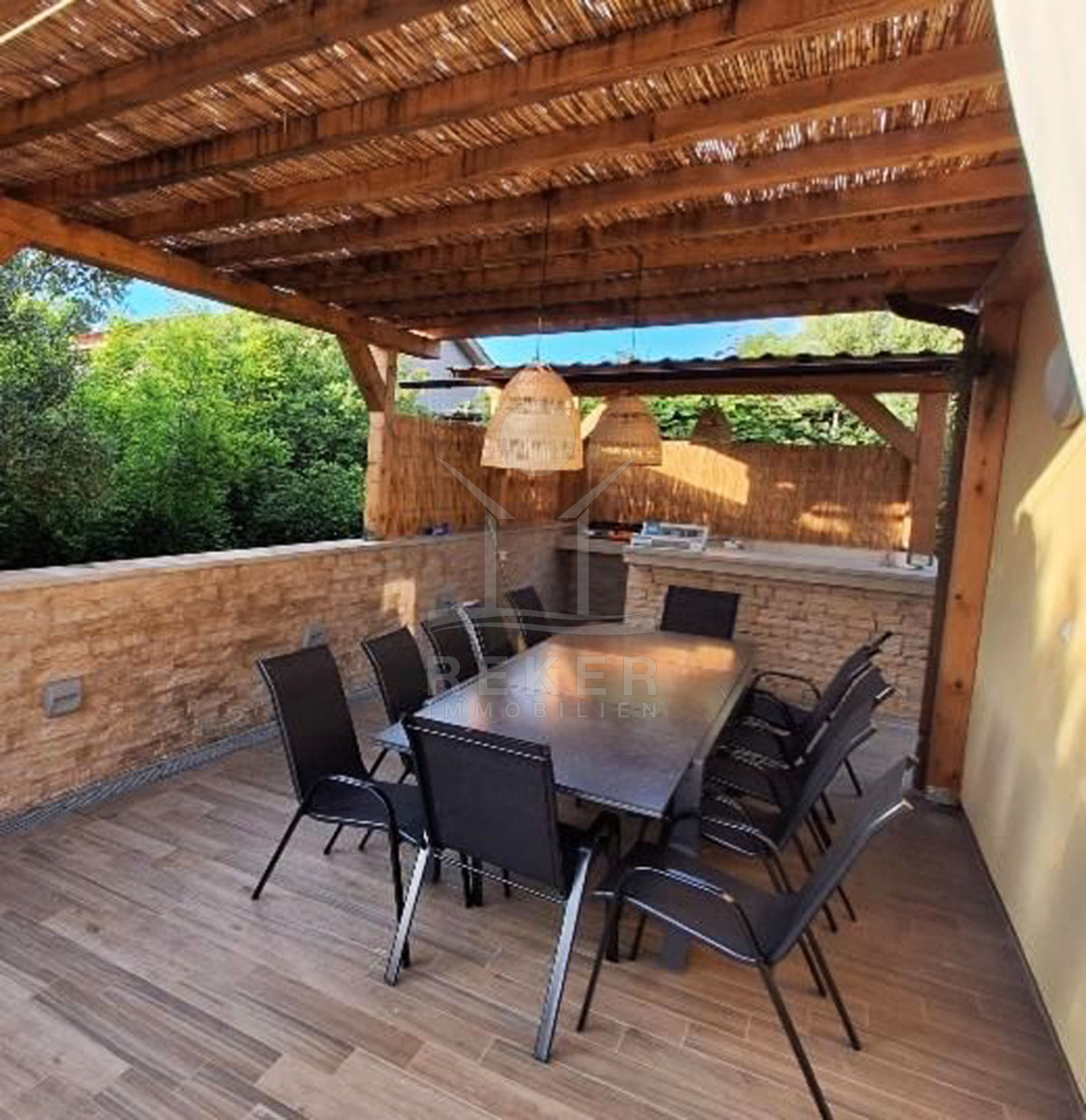 Die Terrasse der Villa begeistert mit einem Swimmingpool, einer Außendusche und einer einladenden Liegewiese, die zum Sonnenbaden einlädt. Ein überdachter Bereich wartet darauf, Gäste zu empfangen und bietet ein schönes schattiges Plätzchen zum Verweilen. Genießen Sie das Leben im Freien und verbringen Sie entspannte Stunden in dieser reizvollen Villa.