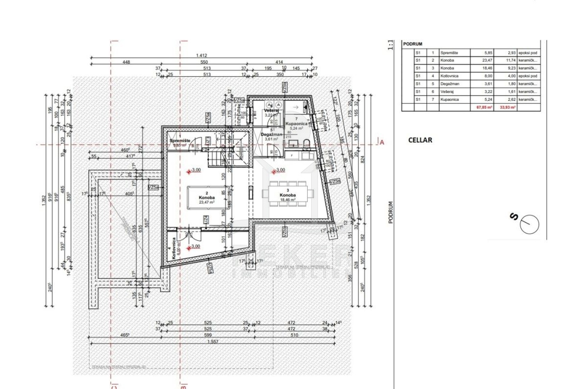 Im 67,85 m² großen Keller finden Sie 3 Abstellräume, Heizungsraum, Waschküche, Bad und Hauswirtschaftsraum, während das Erdgeschoss Wohnzimmer, Küche, Essbereich, Treppenhaus und ein separates Studio-Apartment beinhaltet.