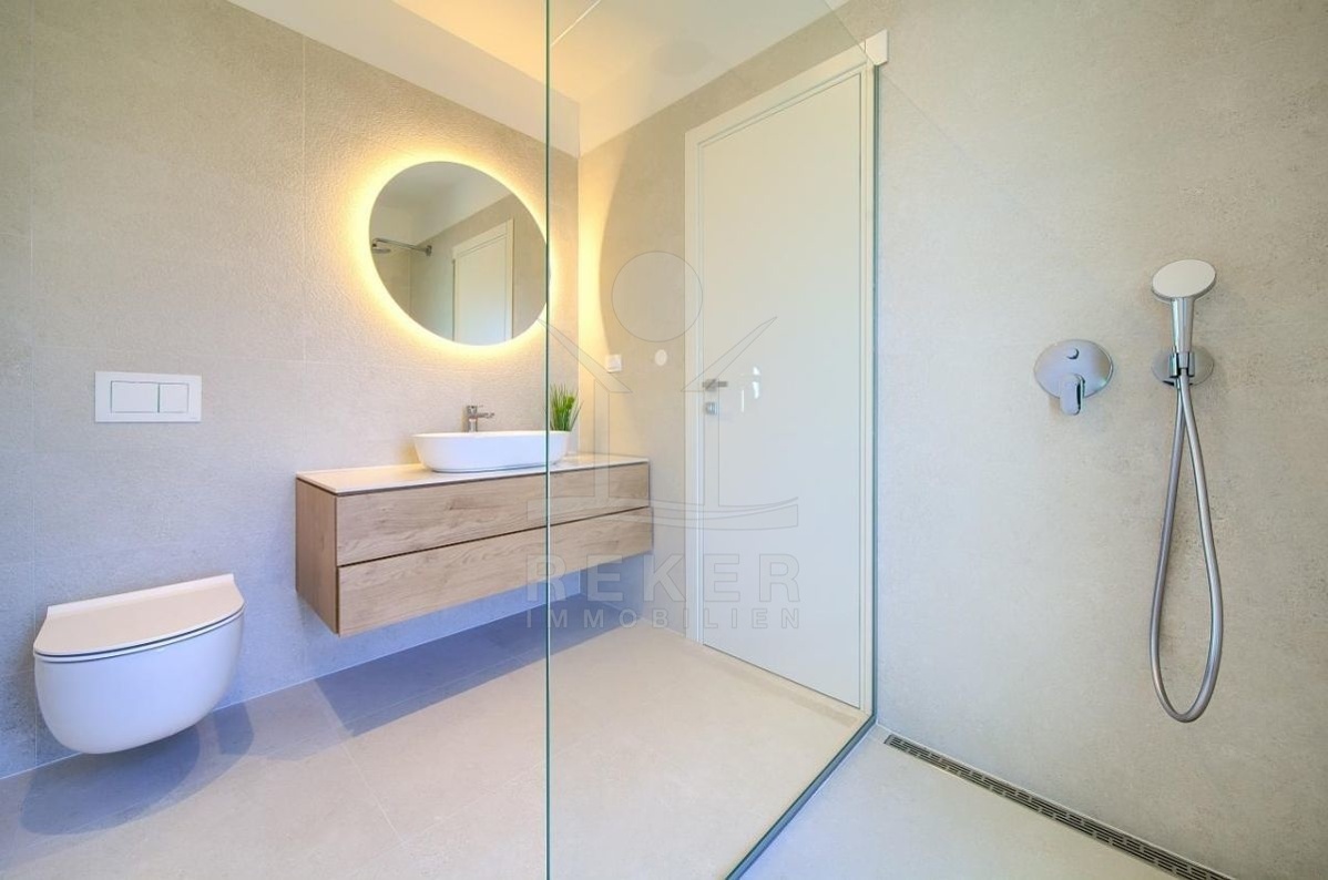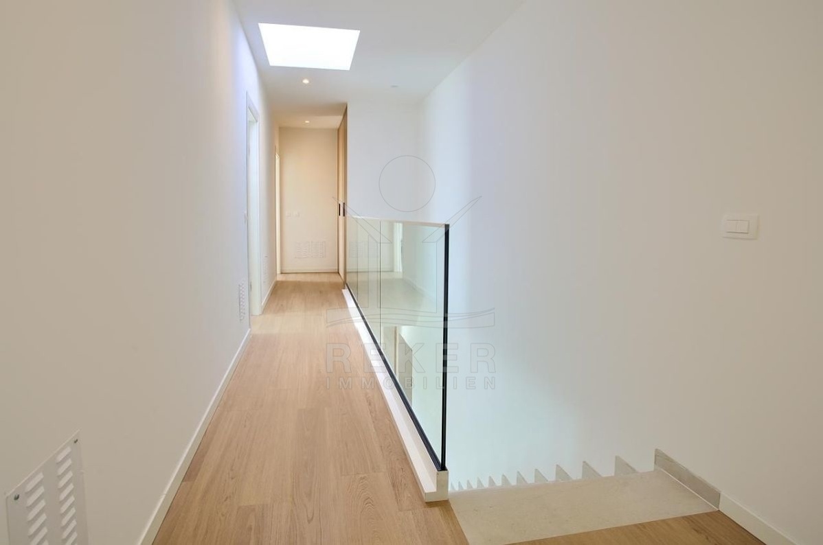 161 m² Wohnfläche, gut aufgeteilt. Unten: offener Wohn- und Essbereich, Küche, ein Schlafzimmer, Bad, Gäste-WC, Abstellraum und Zugang zur Terrasse. Oben: drei Schlafzimmer – jedes mit eigenem Bad und Zugang zum Balkon. Alles hochwertig gemacht: schöne Böden, Klimaanlage in allen Räumen. Im Keller liegt der Technikraum. Baujahr: 2023. Alles neu. Alles bereit.