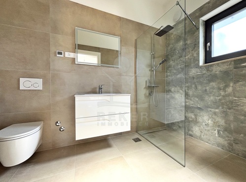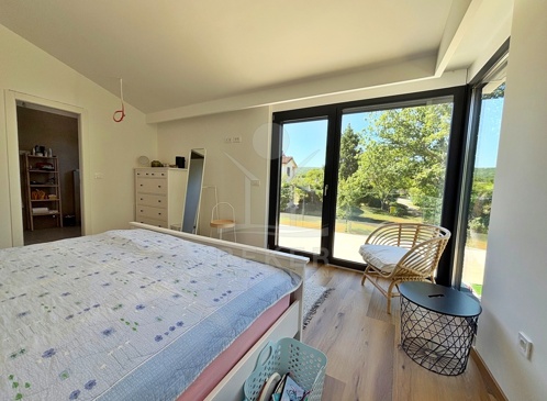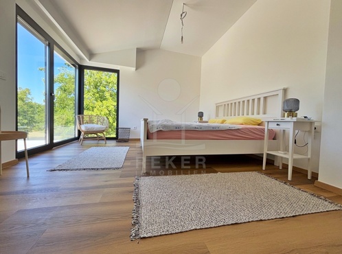 Kršan ist kein Ort für Hektik. Wer hierherkommt, sucht Ruhe – und findet sie. Am Ortsrand steht dieses freistehende, moderne Haus. Ganz in Weiß, klar und elegant. Umgeben von viel Grün und Luft. Die Zufahrt führt direkt zum Hof, wo mehrere Fahrzeuge bequem Platz haben. Der gesamte Bereich ist eingefriedet – ideal für alle, die Wert auf Privatsphäre legen.