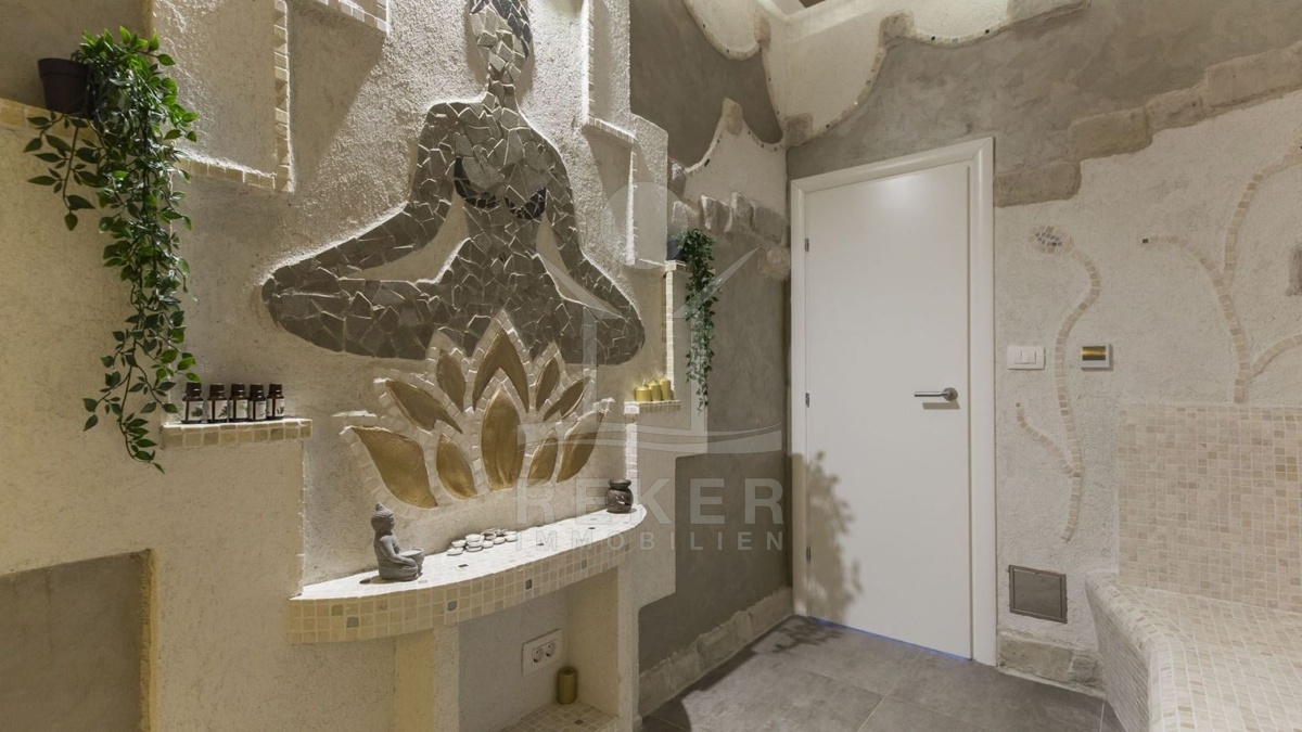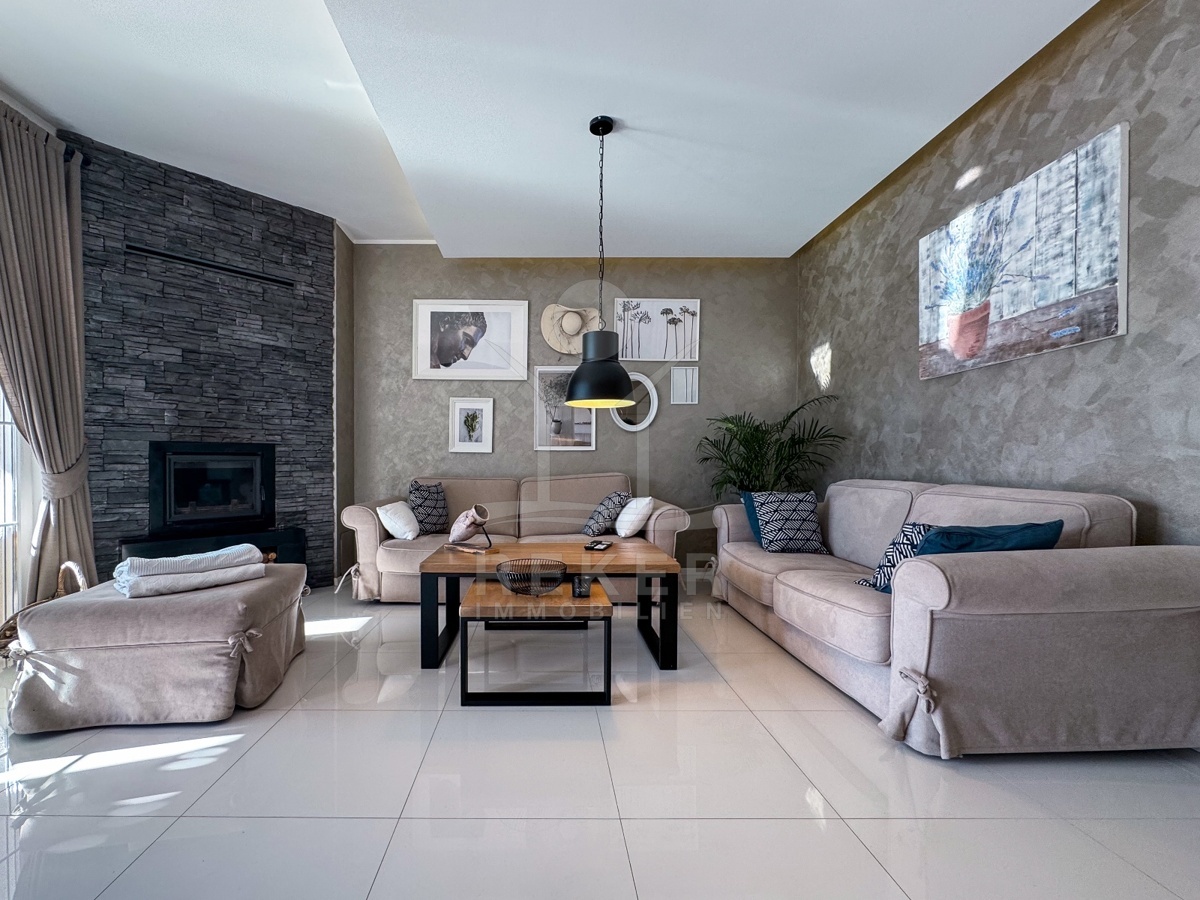 Der Außenbereich bietet alles für entspannte Stunden. Im Mittelpunkt steht der 58 m² große Infinity-Pool mit Gegenstromanlage, Massagedusche, Kinderzone und Unterwasserbank. Die großzügige Sonnenterrasse mit Lounge, Essbereich und Sommerküche mit Grill schafft ein Ambiente zum Genießen. Der liebevoll angelegte Garten mit Palmen und Kräutern bietet mehrere ruhige Sitzplätze. Ein Jacuzzi für sechs Personen und ein Wellnessbereich mit Sauna, beheiztem Laconium, Dusche und WC sorgen für Entspannung zu jeder Jahreszeit. Für Kinder gibt es einen kleinen Spielplatz. Erbaut im Jahr 2020, verbindet diese Villa Design, Komfort und mediterrane Lebensqualität. Eine Kombination, die Ruhe und Stil auf besondere Weise vereint.
