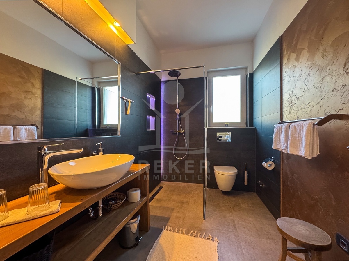 Im Obergeschoss bieten drei Schlafzimmer jeweils ein eigenes Bad mit begehbarer Dusche sowie Fußboden- und Wandheizung. Zwei Zimmer haben Zugang zu einer großen Terrasse mit freiem Meerblick. Glas, Stein und Holz prägen das Ambiente und schaffen eine warme, elegante Atmosphäre.