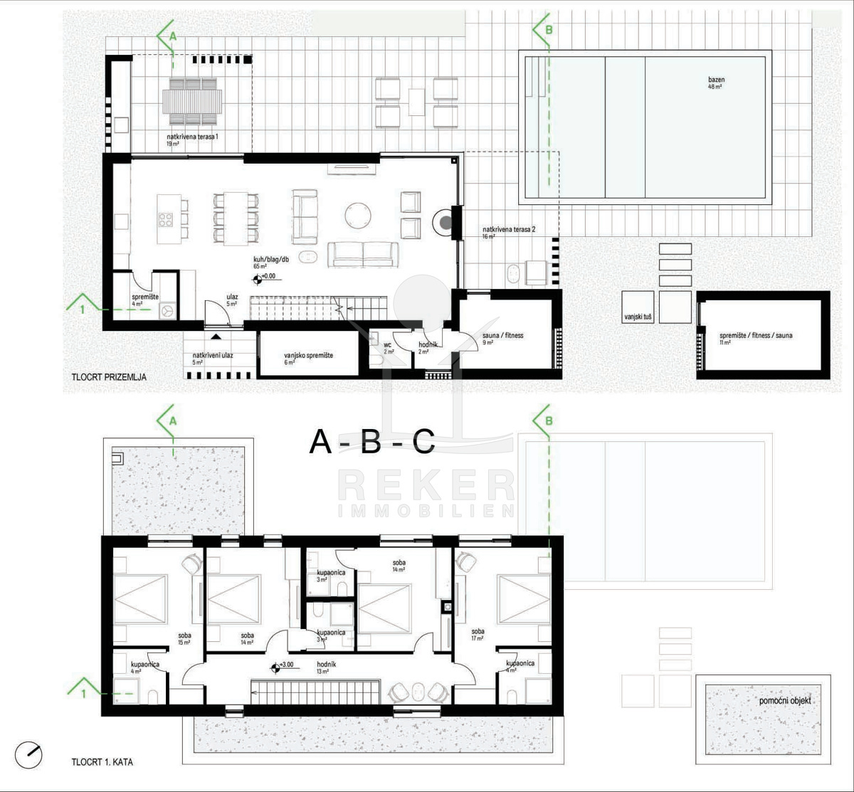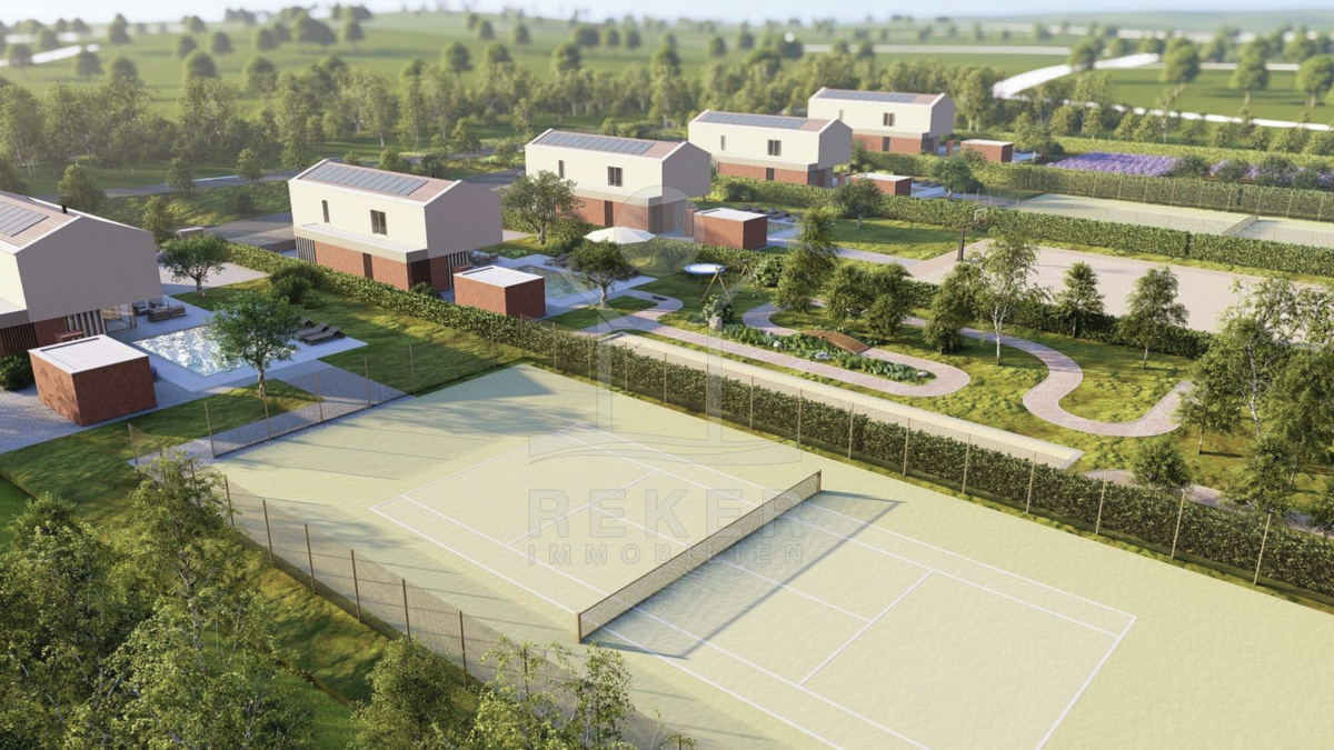 Die Grundstücke sind zwischen 896 und 1.270 m² und bieten eine Wohnfläche von 176 m² auf 2 Etagen. Jedes Haus ist mit einem Erdgeschoss und einem ersten Stock ausgestattet. Sie bieten einen 9 × 5,3 m großen Pool und ein Nebengebäude mit 12 m² als Außenlager. Die Villen werden mit Photovoltaikmodulen (5,46 kWp), einem Inverter-Klimaanlage sowie Fußbodenheizung ausgestattet. Die Zufahrten und Parkplätze liegen oberhalb des Erdgeschosses und sind über wenige Stufen erreichbar, sodass die Villen von der Hauptstraße aus nicht einsehbar sind. (Der Sportplatz ist nicht im Preis inbegriffen!)